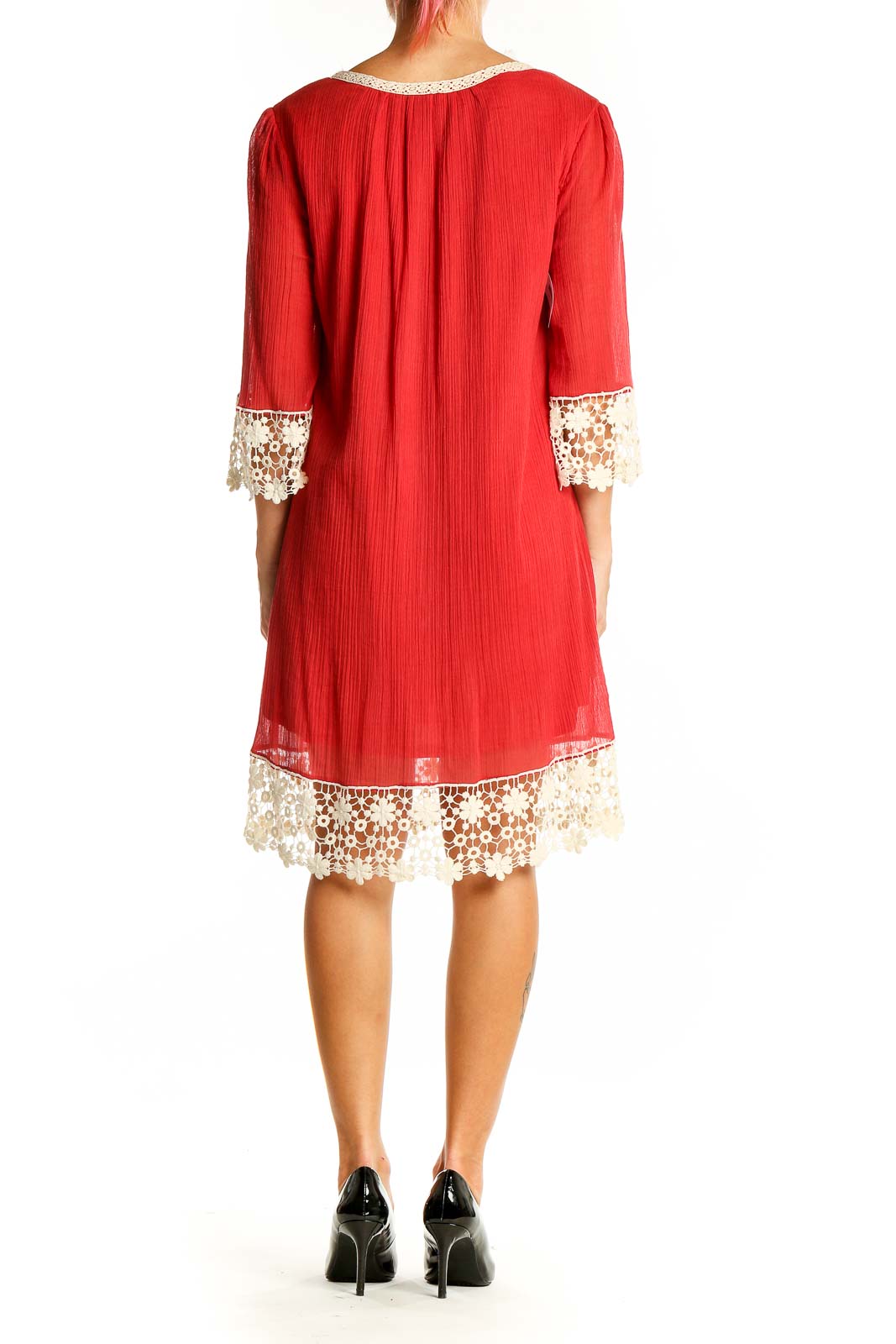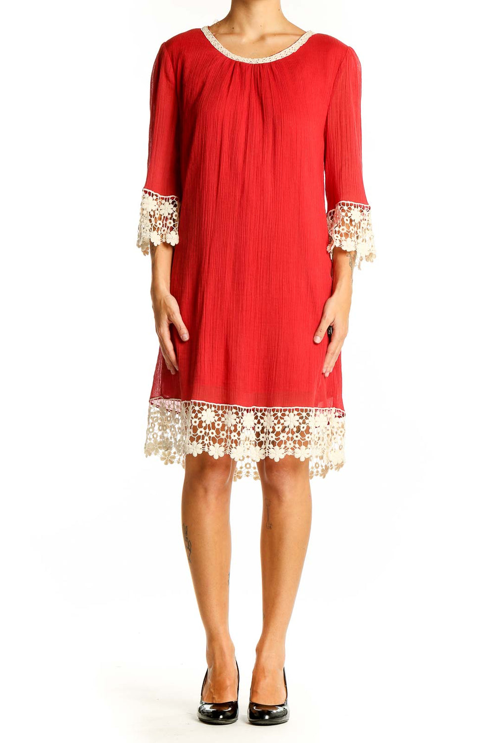 Embrace effortless bohemian style with this stunning red shift dress by Umgee. Crafted from a soft blend of cotton and polyester, this dress offers both comfort and breathability. The flowing silhouette is enhanced by delicate cream lace trim at the neckline, sleeves, and hem, adding a touch of romantic charm. Three-quarter length sleeves with lace cuffs provide versatile coverage, making this dress perfect for various occasions. The gathered neckline creates a flattering drape, while the knee-length cut offers a modest yet fashionable look. In excellent condition, this dress is a versatile addition to your wardrobe, easily dressed up or down for any event.