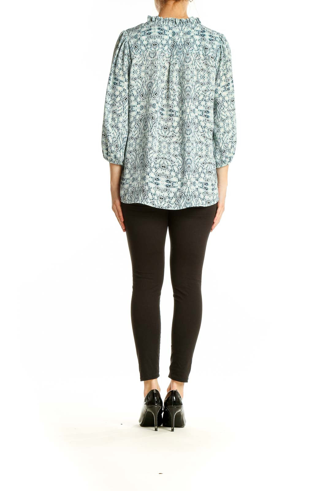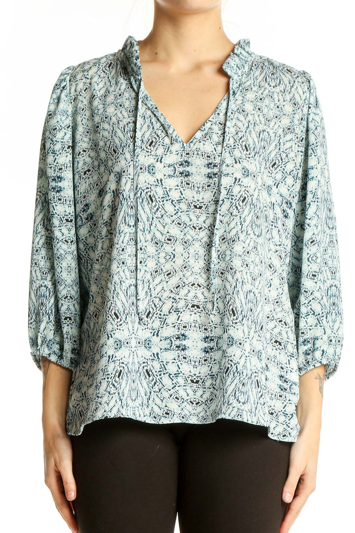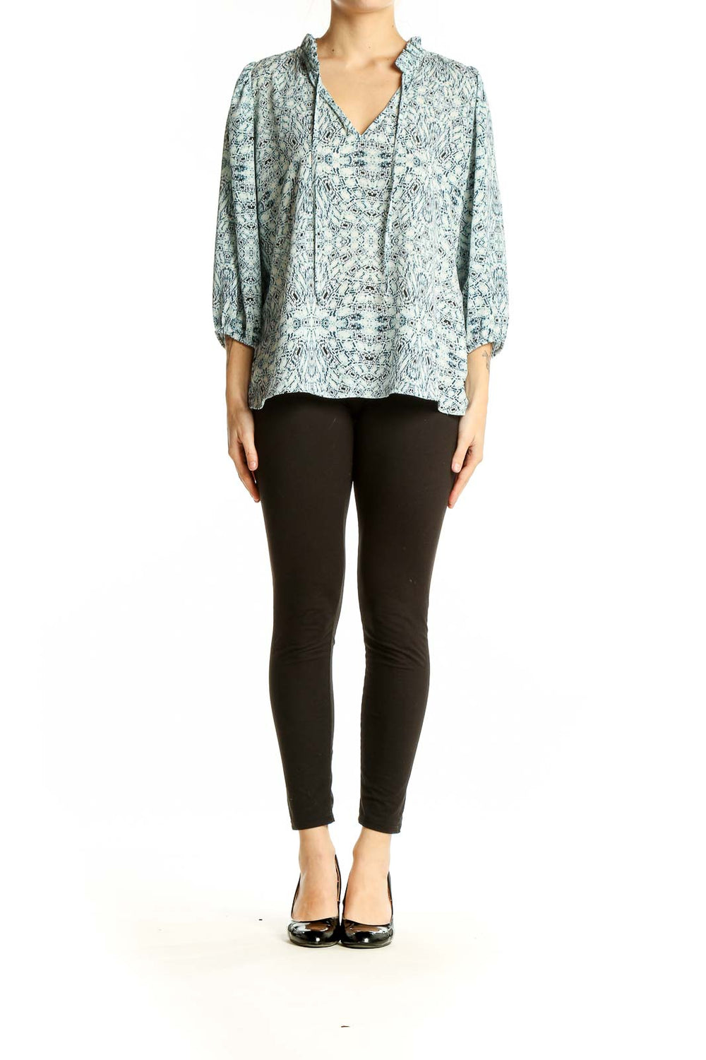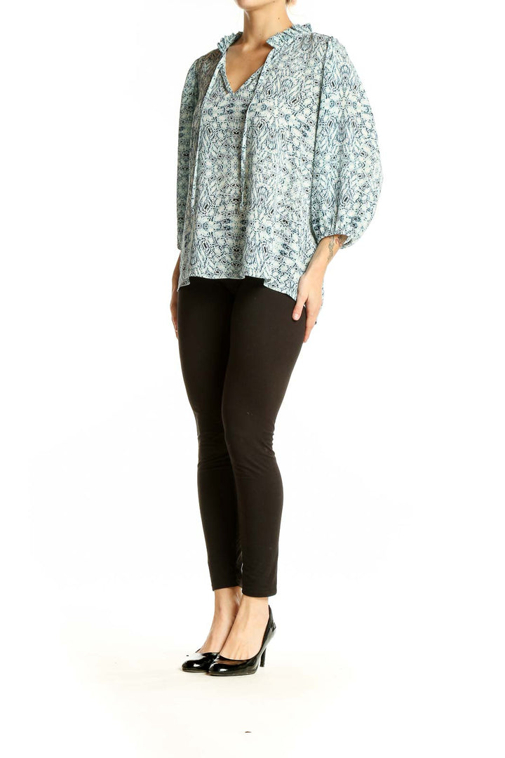 The blouse features a flattering V-neckline with a tie detail, adding a touch of bohemian flair. The billowy three-quarter length sleeves with elastic cuffs provide a romantic silhouette while offering versatility for various seasons. The relaxed fit through the body ensures comfort and ease of movement, making it an ideal choice for everyday wear.