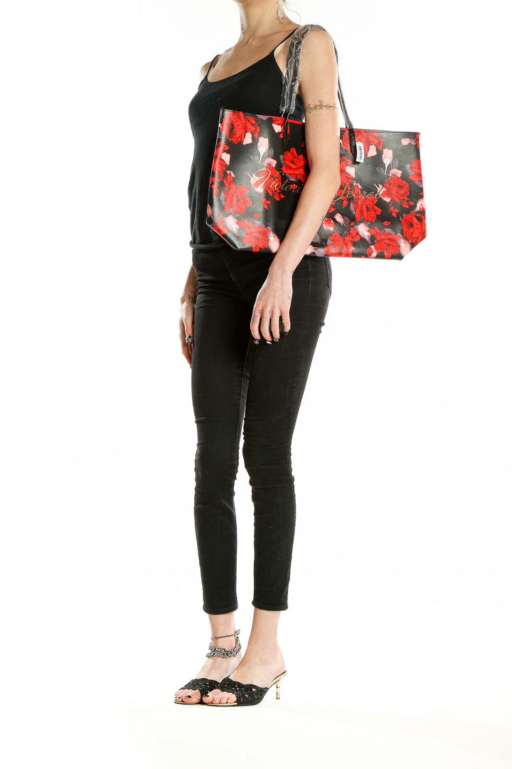 Victoria's Secret Black Floral PVC Tote Bag with red rose print, front view