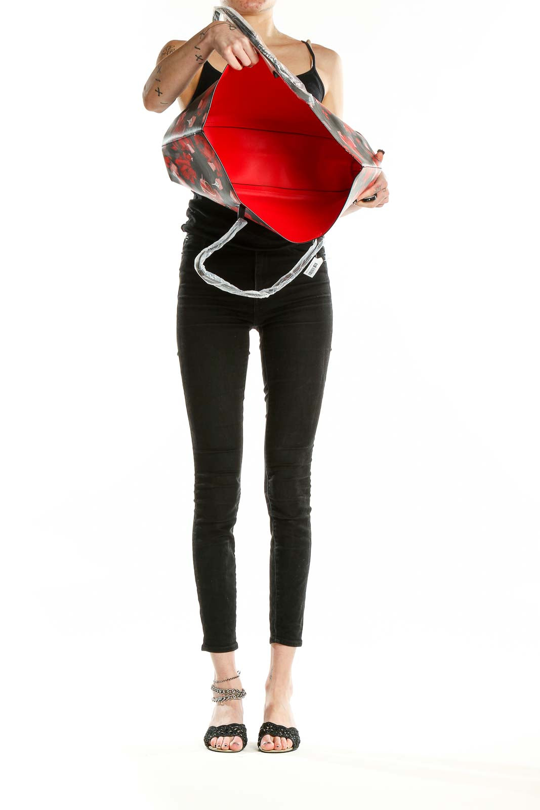 Victoria's Secret Black Floral PVC Tote Bag open to show red interior, held by model