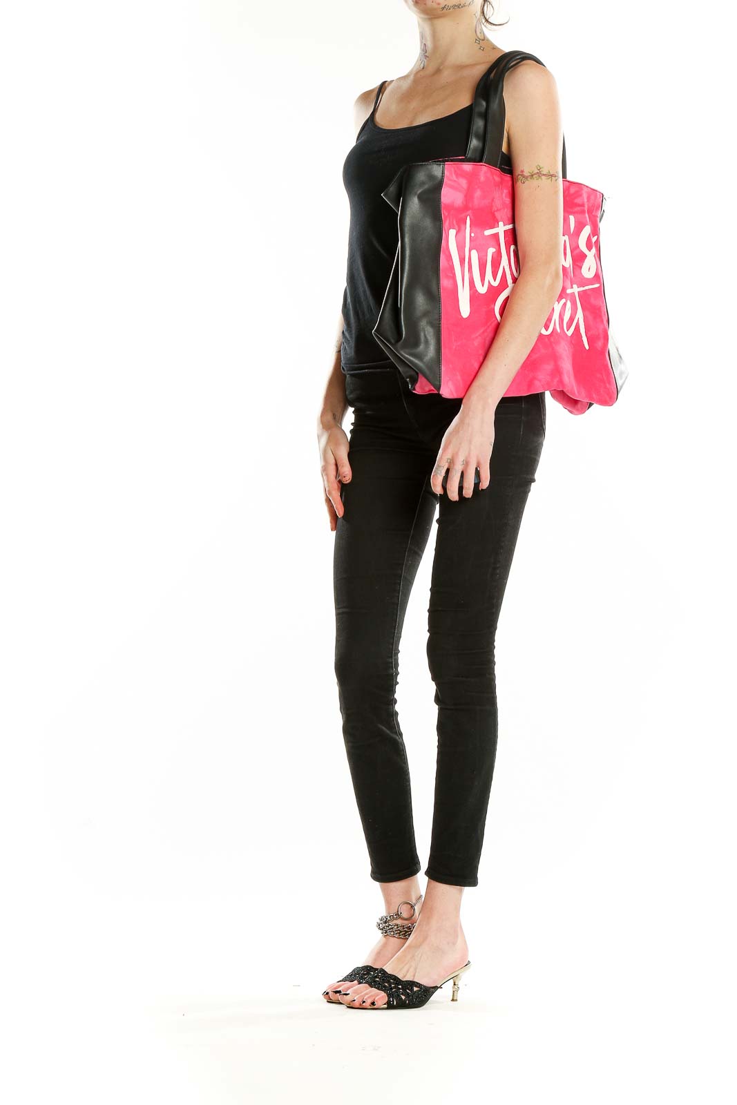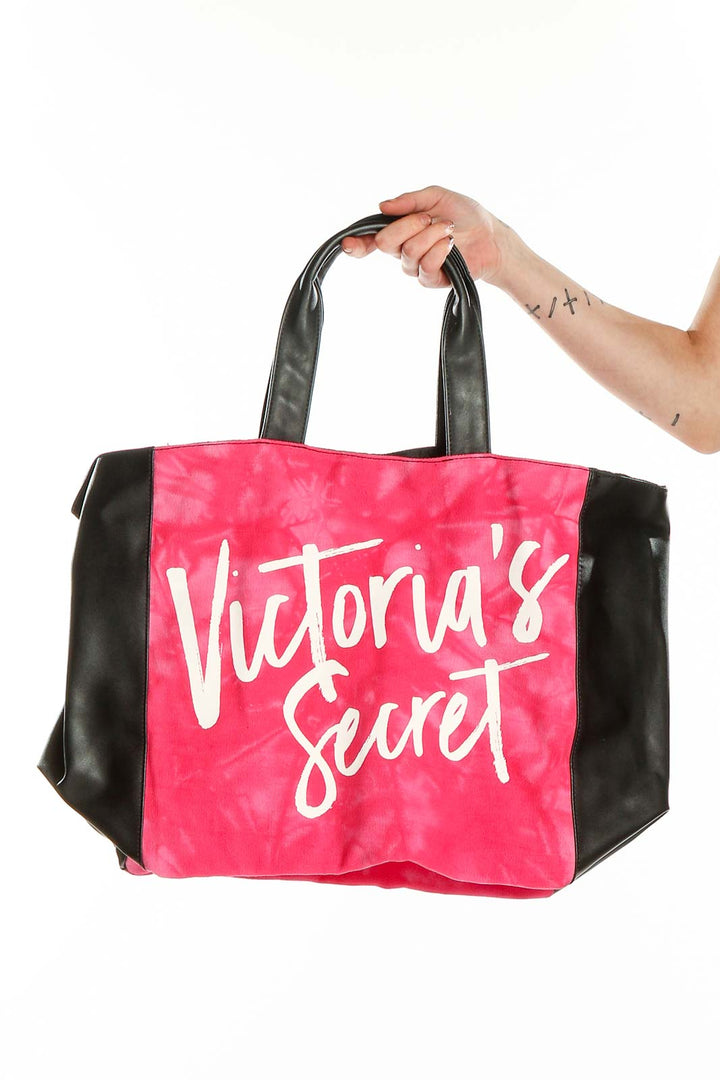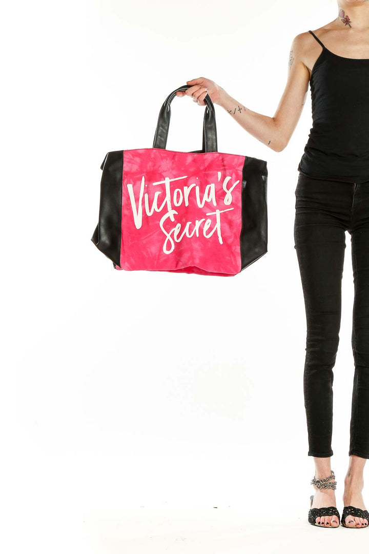 Front view of Victoria's Secret pink tote bag with white logo and black trim