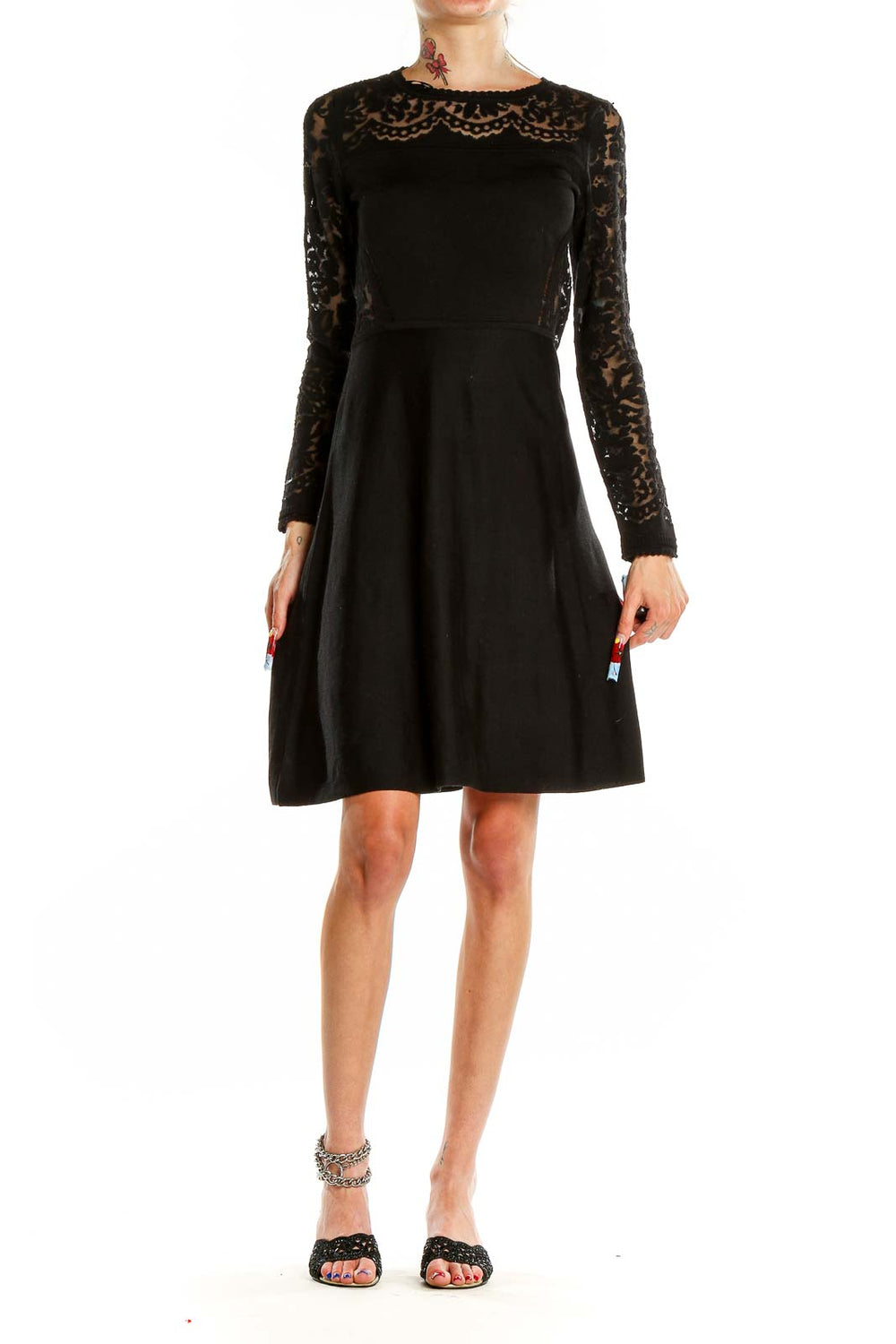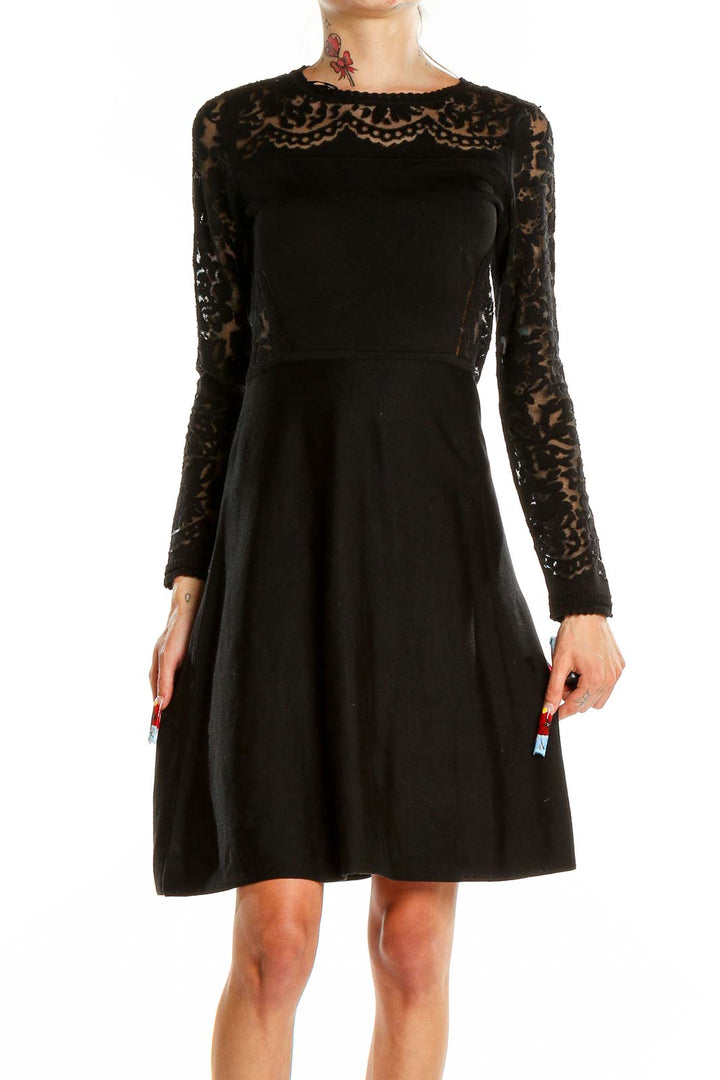 Elevate your style with this stunning black fit-and-flare dress from Vince Camuto. The dress features an elegant lace design on the sleeves and upper bodice, creating a beautiful contrast against the solid black fabric of the skirt. The fitted waist accentuates your figure, while the flared skirt adds a touch of feminine charm. Crafted from a blend of cotton, polyester, and viscose, this dress offers both comfort and durability. The knee-length cut and long sleeves make it versatile for various occasions, from office wear to evening events. In excellent condition, this size small dress is a timeless addition to your wardrobe.