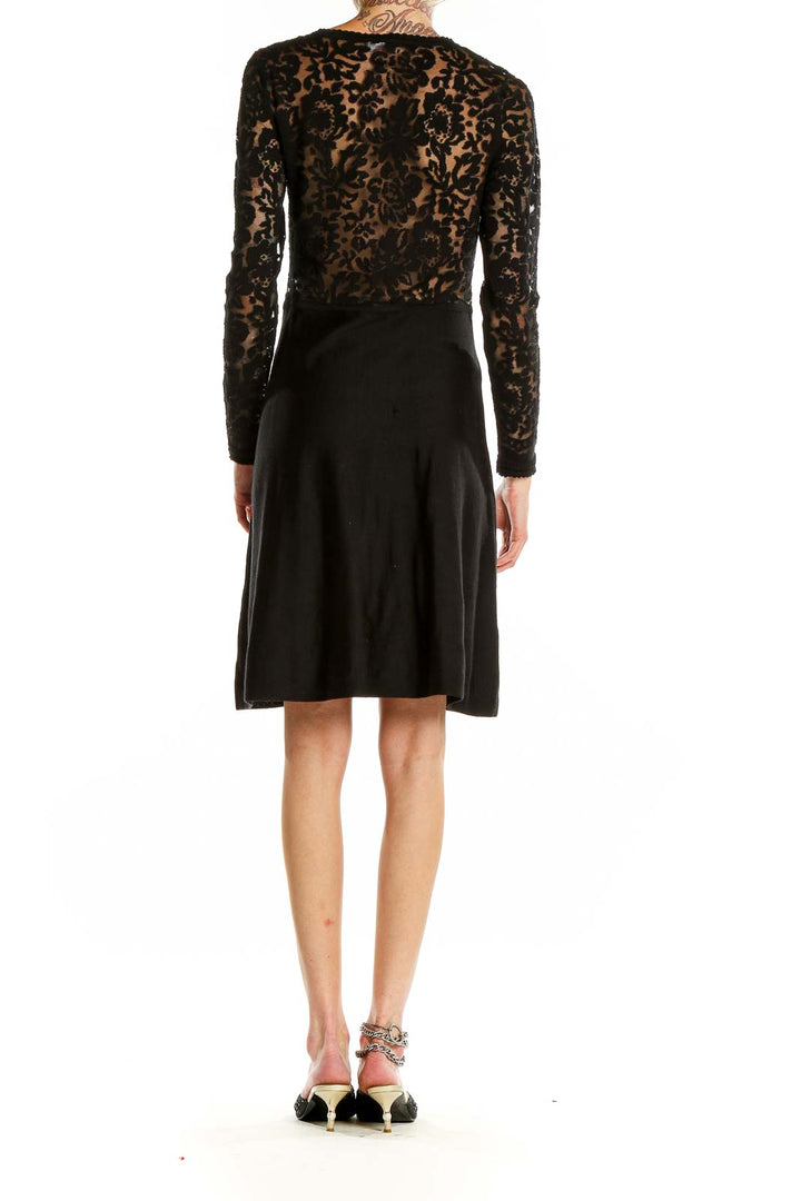 Back view of Vince Camuto black lace-sleeve fit-and-flare dress showing lace detail