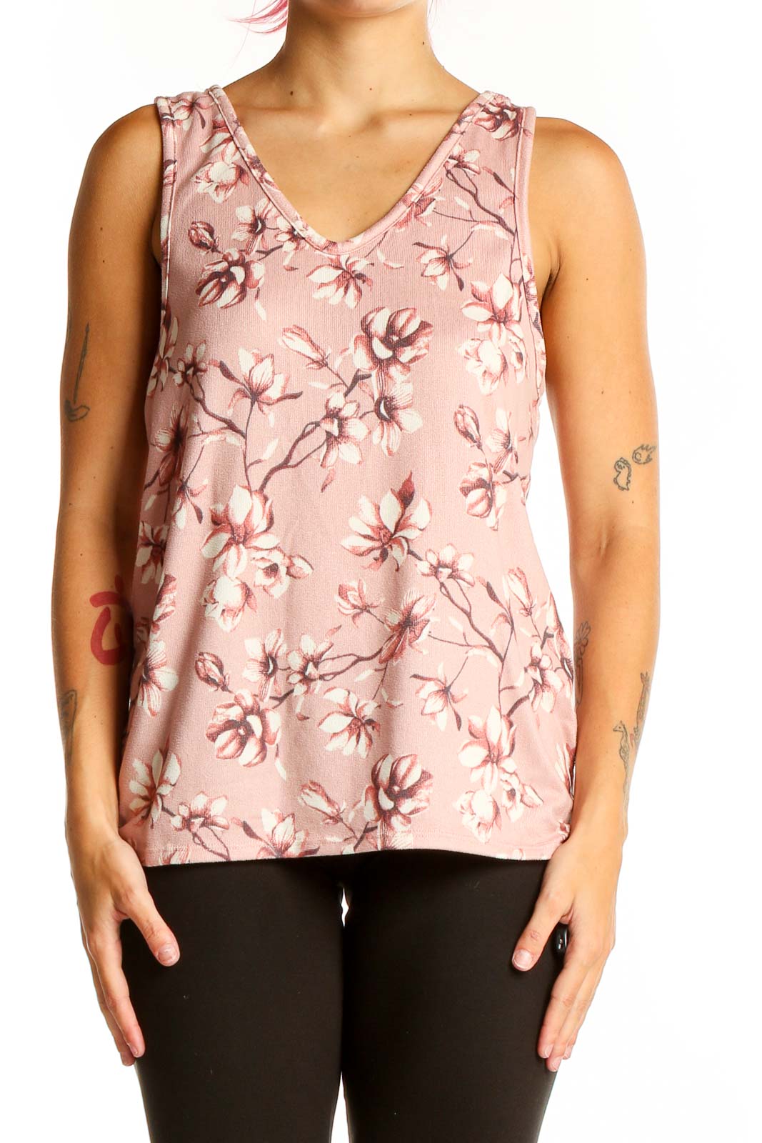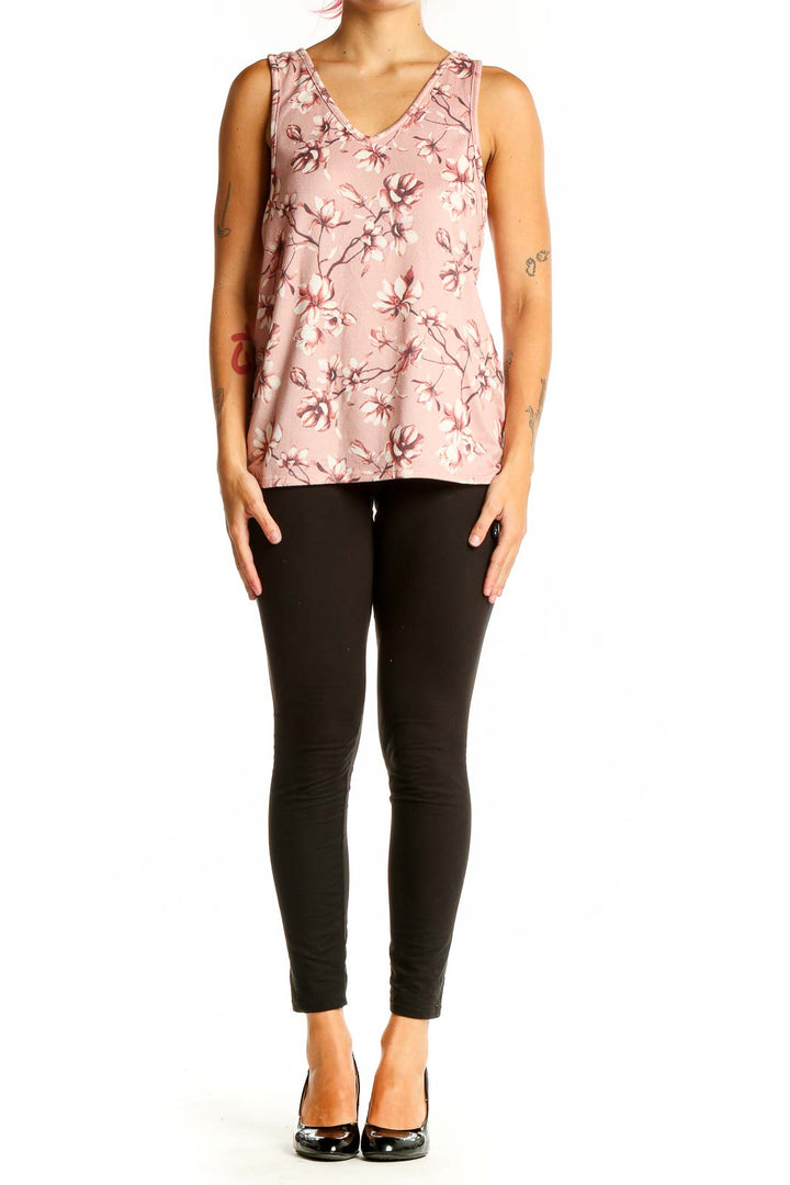 The V-neckline adds a touch of elegance, while the sleeveless design keeps you cool and comfortable. The flowing silhouette flatters various body types and provides a relaxed fit. The soft pink background complements the floral pattern beautifully, making it a versatile piece that pairs well with both casual and dressier outfits.