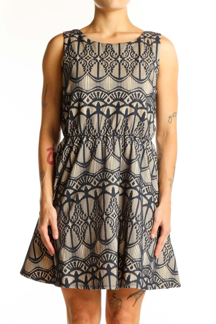Step into elegance with this stunning beige sleeveless dress from Want And Need. The intricate lace-like pattern in navy blue creates a mesmerizing visual effect, perfect for any special occasion. The dress features a flattering fit-and-flare silhouette with a gathered waist that accentuates your curves beautifully.