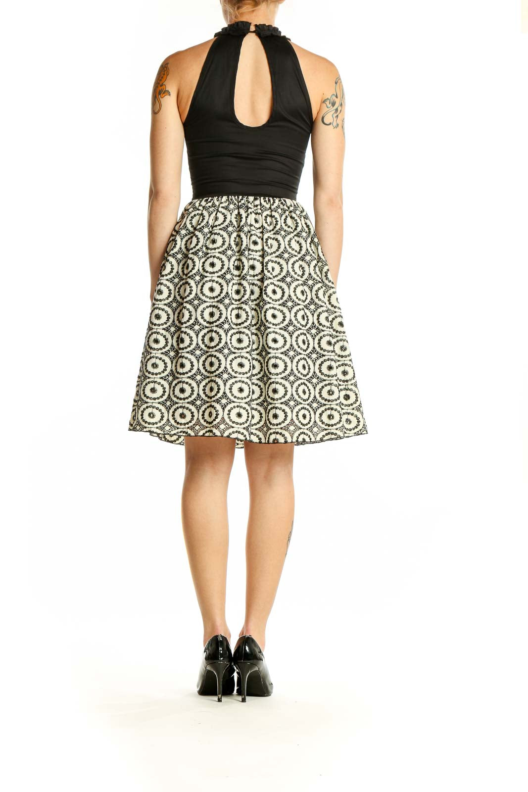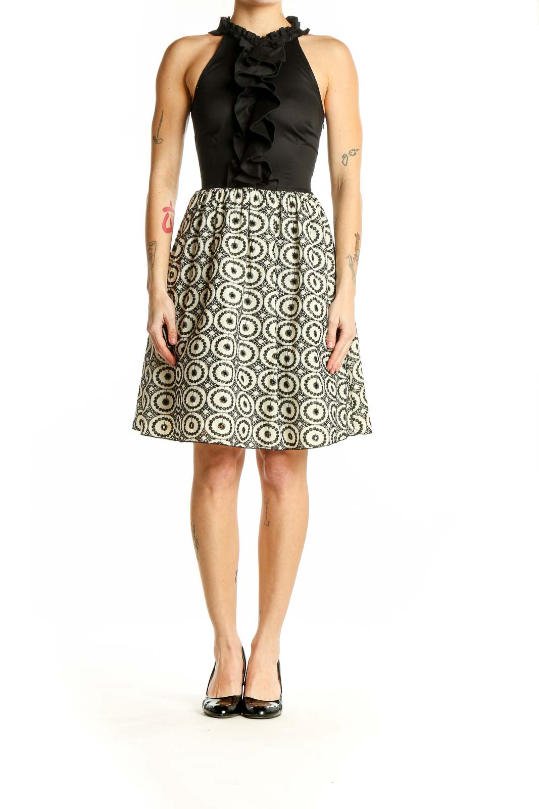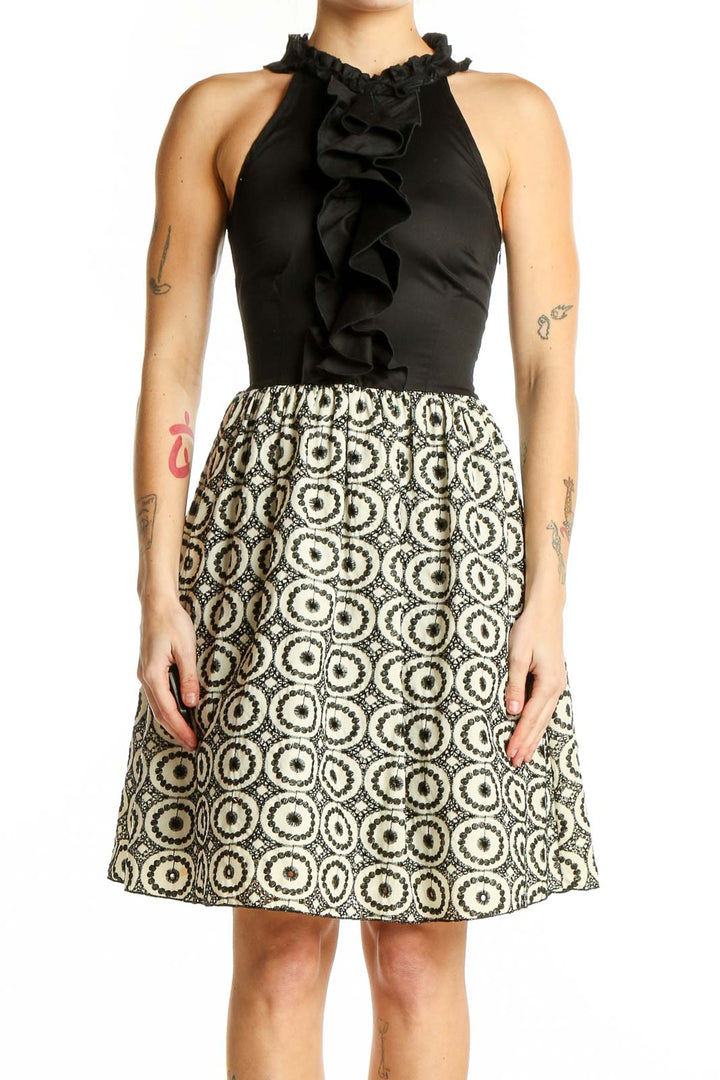 Make a statement with this eye-catching Black and White Geometric Print Halter Dress by Weston Wear. The dress features a sleek black halter top with an elegant ruffle detail along the neckline, adding a touch of feminine charm. The fitted bodice transitions seamlessly into a flared skirt adorned with a striking geometric circle pattern in black and white, creating a visually captivating contrast.