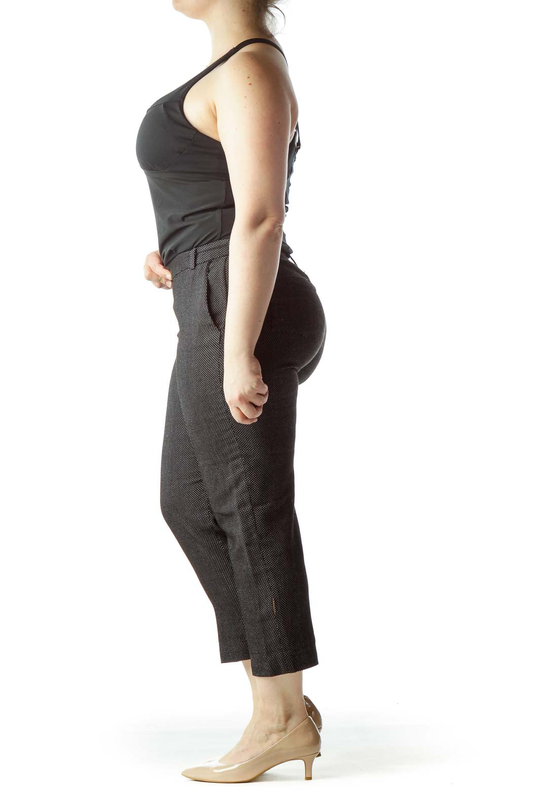 Elevate your professional wardrobe with these sophisticated gray cropped dress pants from Yoana Baraschi. The textured fabric adds a subtle touch of elegance, perfect for the office or formal occasions. These pants feature a flattering high-waisted design and a cropped length that hits just above the ankle, making them versatile for various shoe choices. The excellent condition speaks to their quality and durability. With a comfortable waist measurement of 30" and generous 44" hips, these pants offer both style and ease of movement. The 26" length creates a modern silhouette that's both trendy and timeless. Pair these pants with a crisp blouse for a polished office look or dress them up with heels for an evening out.