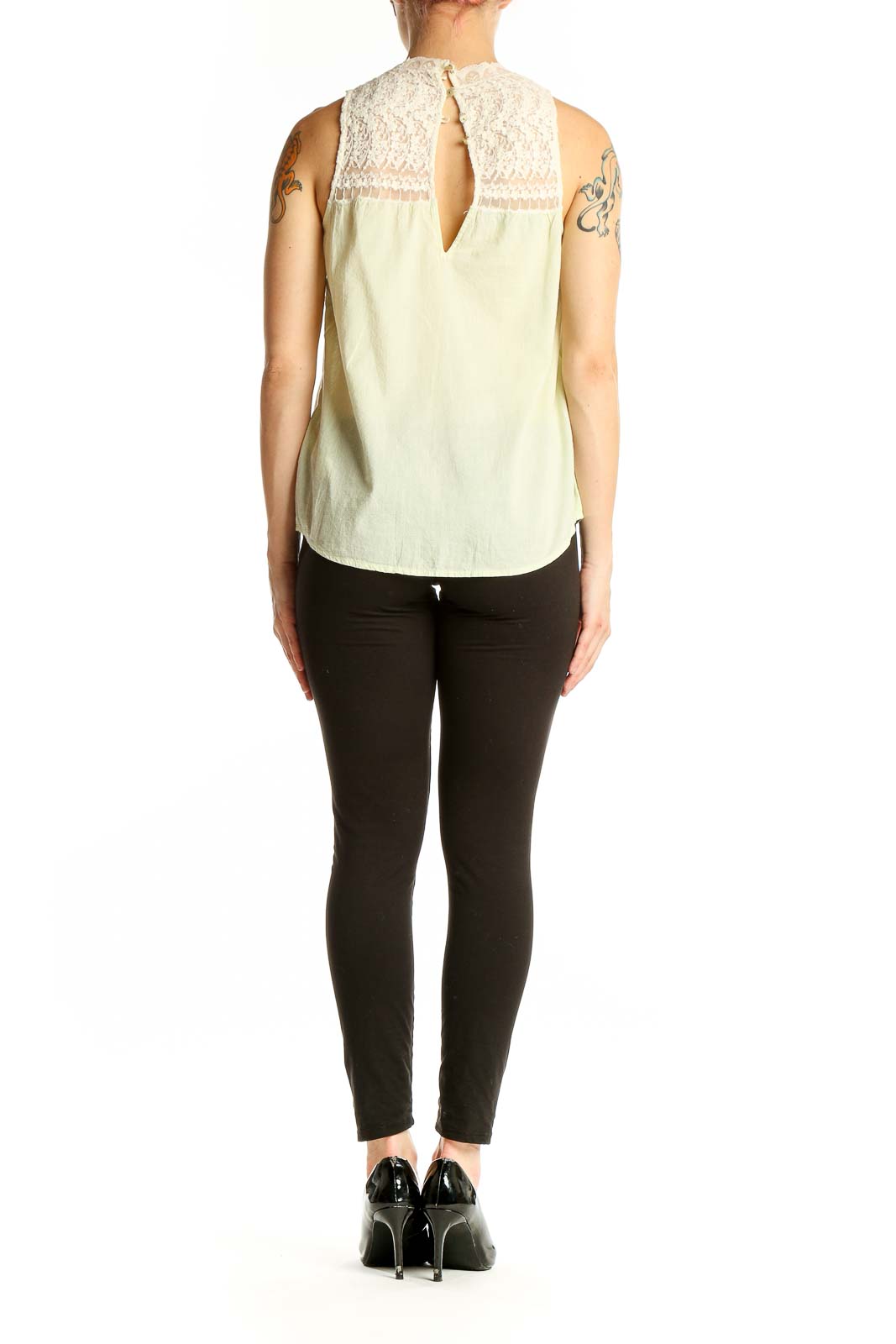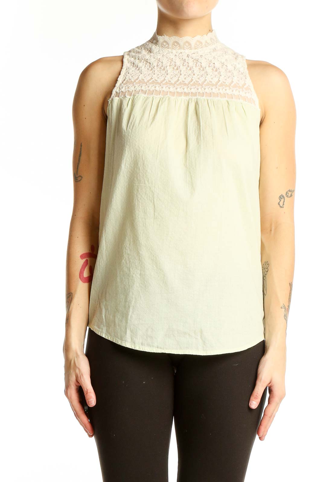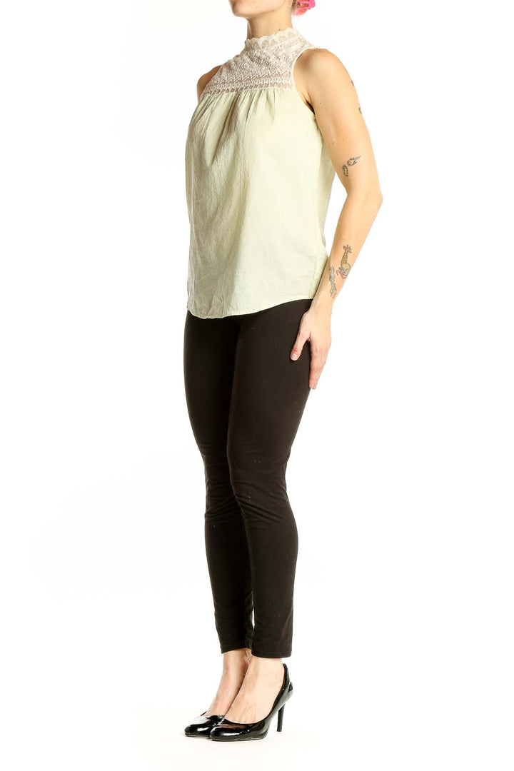 Elevate your summer wardrobe with this exquisite cream sleeveless top from Zara Trafaluc. The standout feature is a delicate lace yoke that adds a touch of romance and sophistication to the high neckline. Made from lightweight nylon, this top offers both comfort and style for warm weather days.