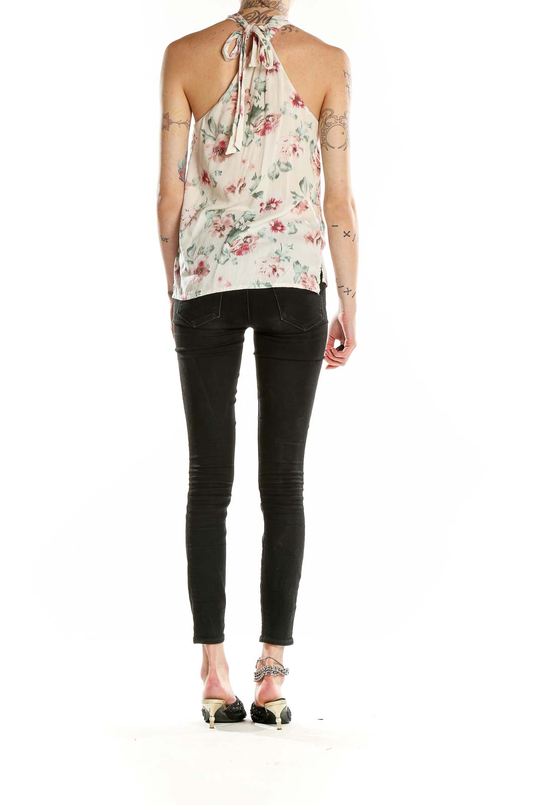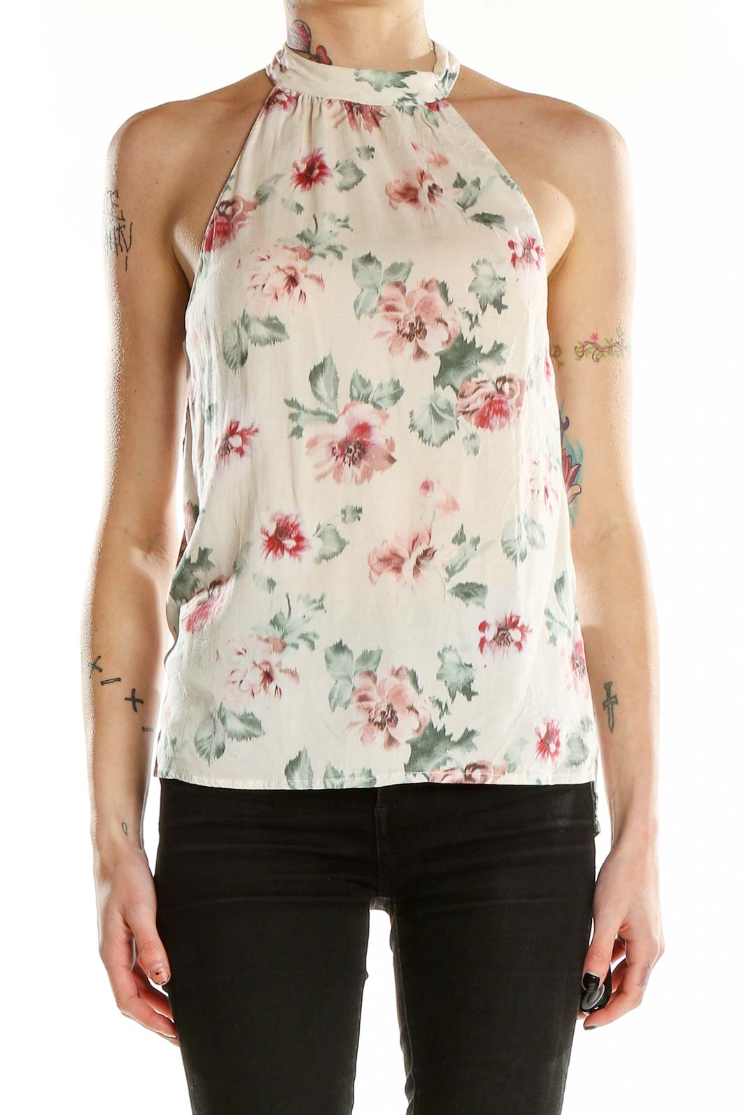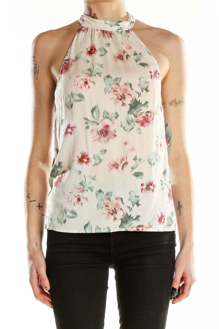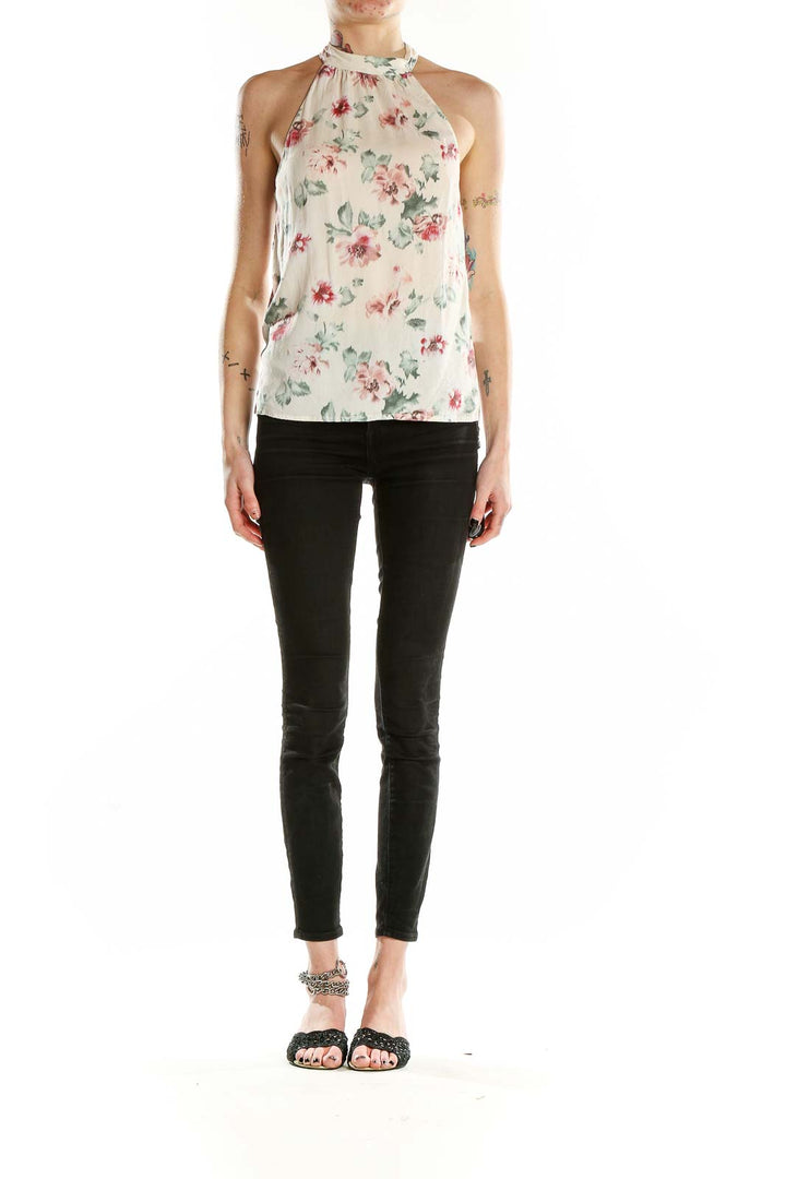 Elevate your summer wardrobe with this charming white floral halter neck top from Zara Trafaluc. The delicate floral print in soft pinks and greens adds a touch of romance to this breezy piece. The halter neckline creates an elegant silhouette, while the lightweight fabric ensures comfort on warm days. The top features a relaxed fit through the body, with a gathered neckline for a flattering drape. The open back design with a tie closure adds a flirty touch, perfect for showing off sun-kissed skin. In good condition, this versatile top pairs beautifully with jeans or shorts for a casual look, or dress it up with a skirt for summer evenings out.