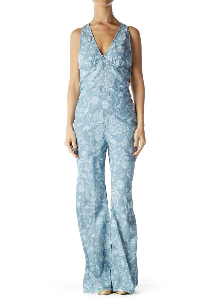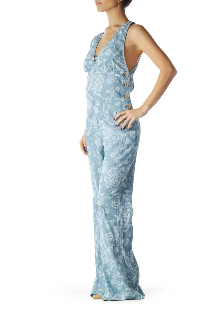 Crafted with a soft, lightweight fabric, this jumpsuit showcases a delicate white floral pattern against a serene light blue background. The sleeveless cut and open back design add a touch of allure, while also keeping you cool and comfortable.