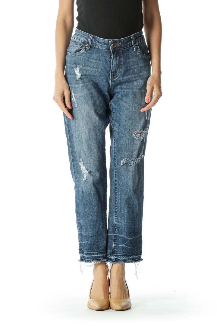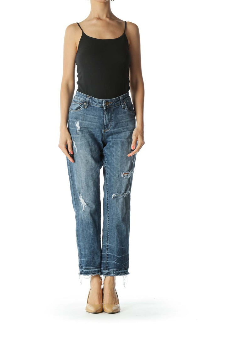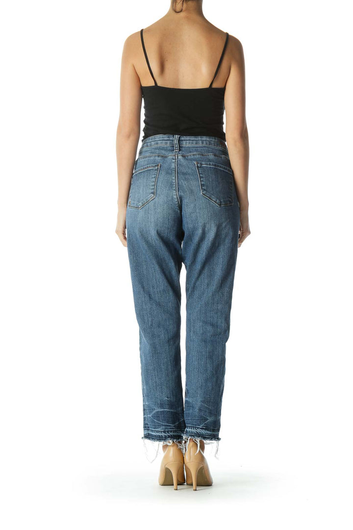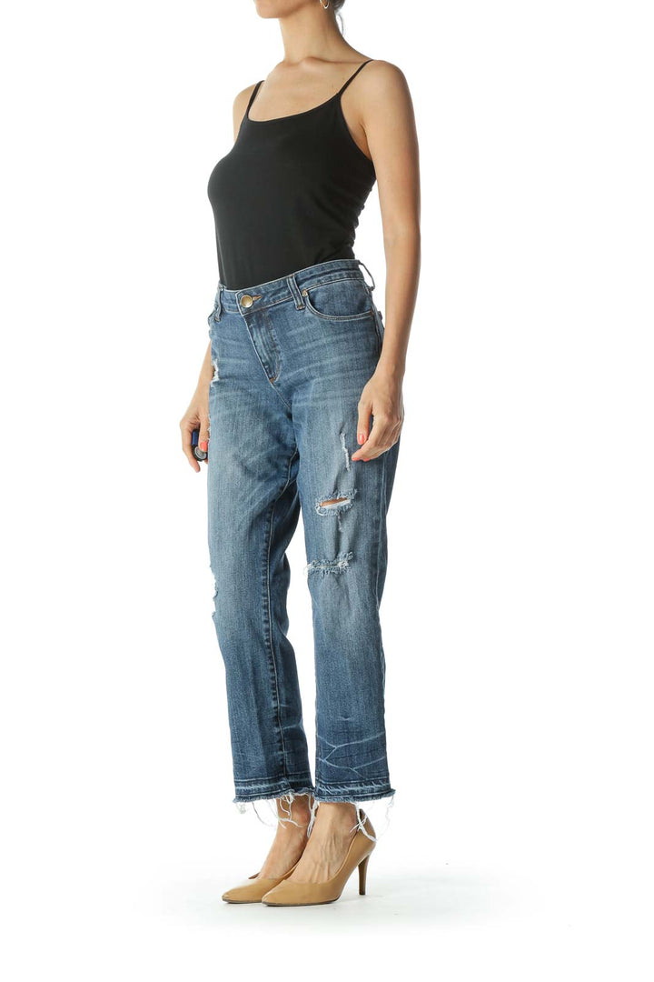 Blue Medium-Wash Distressed Cropped Boyfriend Denim Jeans
