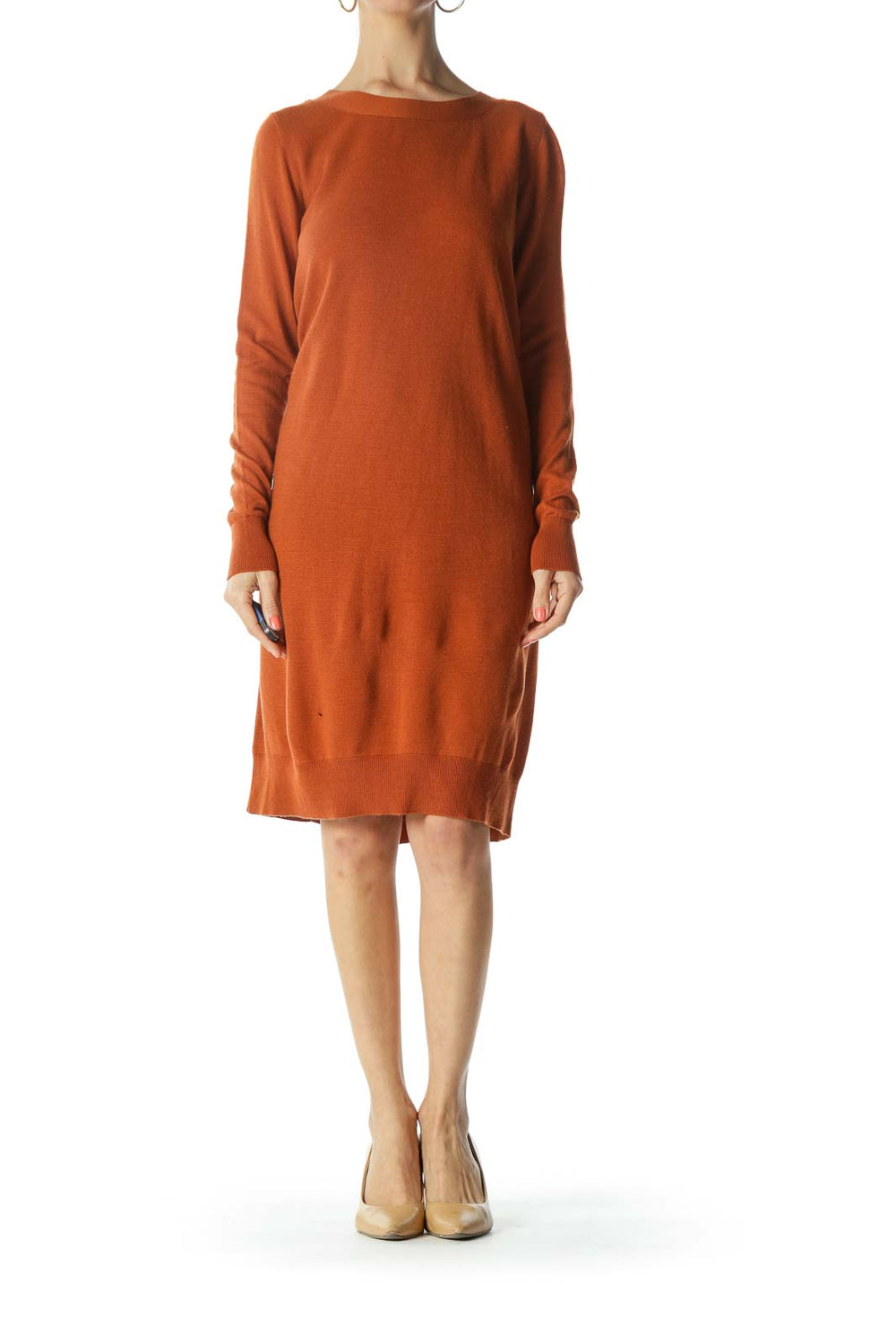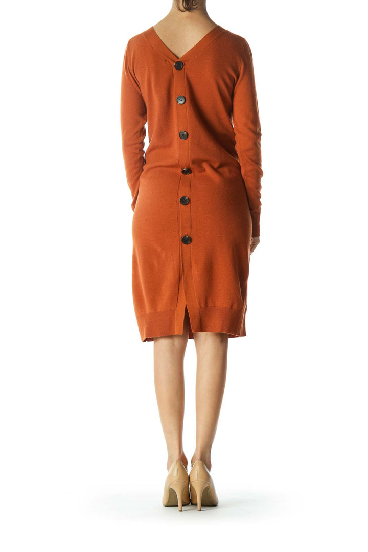 Burnt-Orange Back-V-Neck and Buttoned-Down Knit Dress
