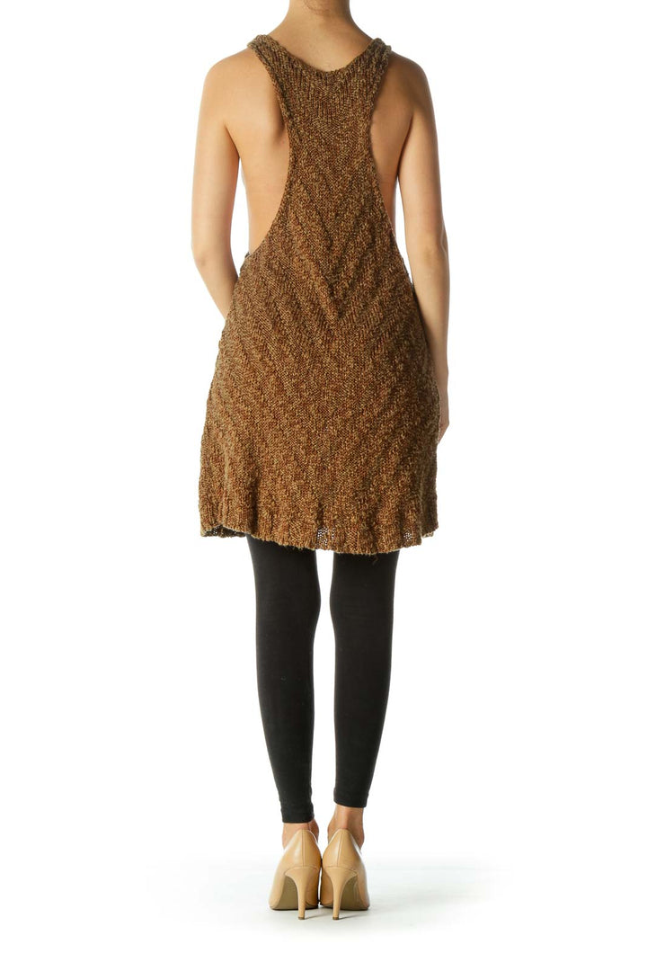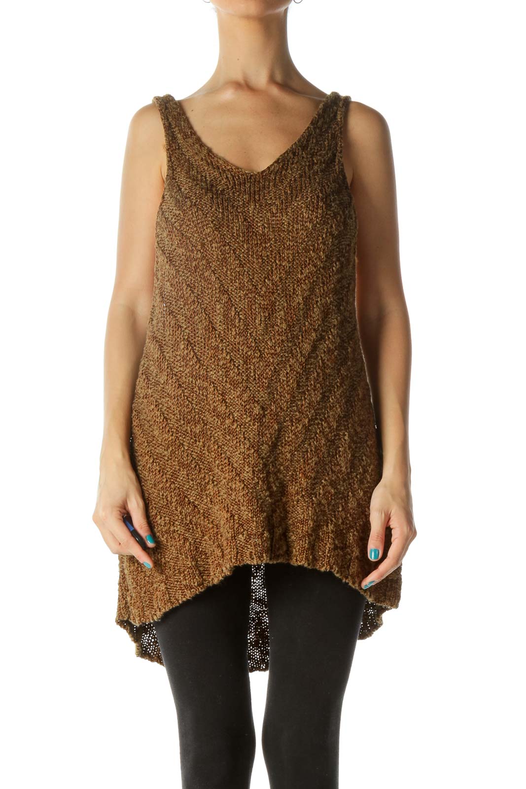 Elevate your casual wardrobe with this stunning brown textured knit tunic from Free People. This sleeveless piece features a beautiful V-neckline and a flattering high-low hemline that adds a touch of modern flair. The intricate knit pattern creates a visually appealing texture that catches the eye and adds depth to the garment.