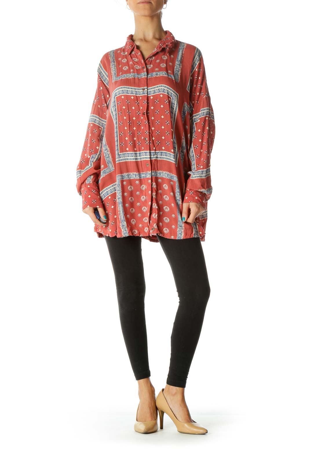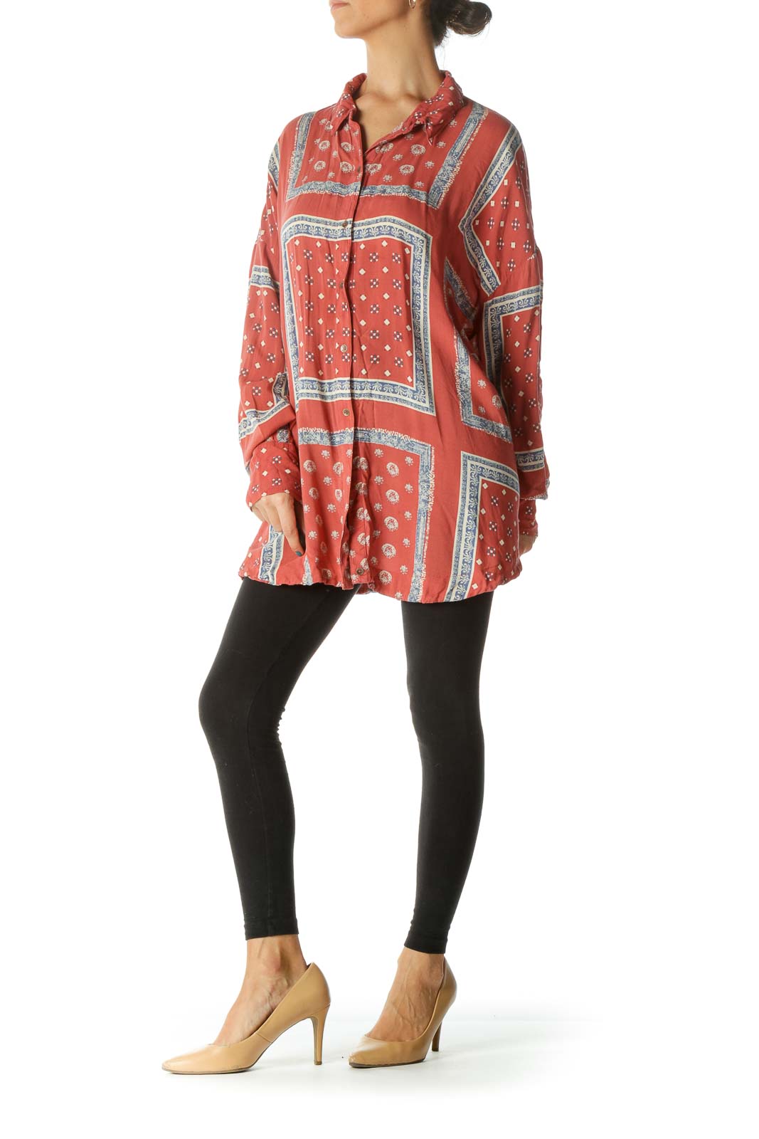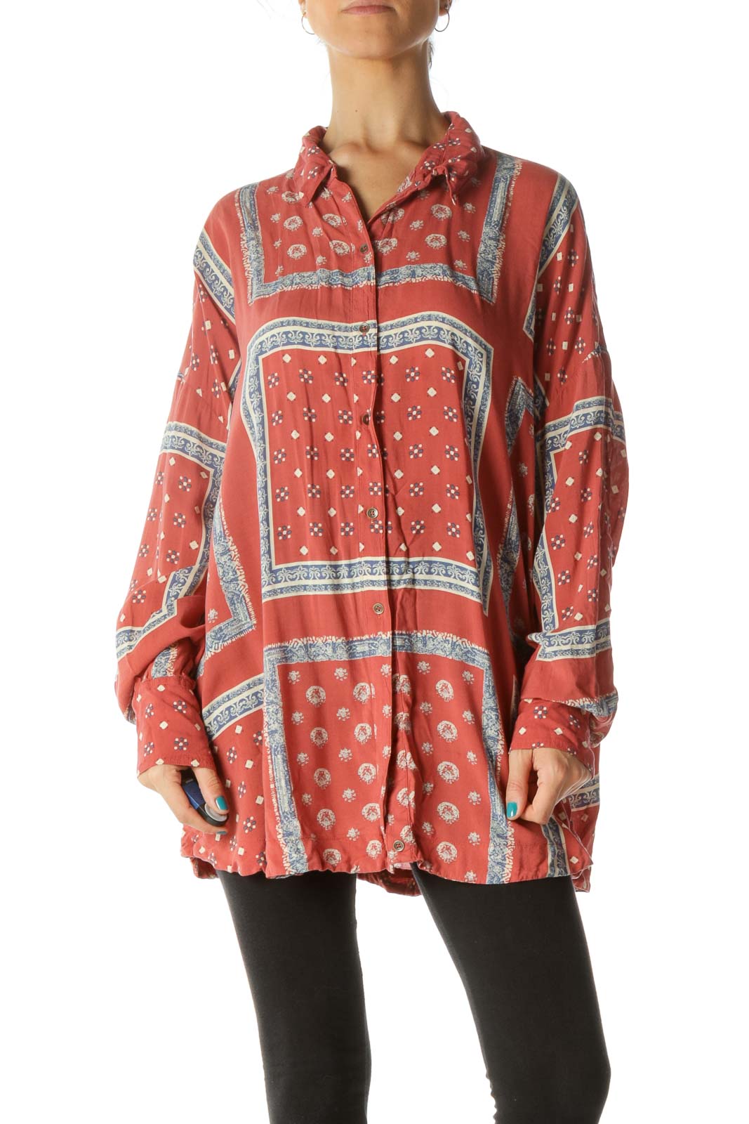 Make a statement with this eye-catching coral patterned oversized button-down shirt from Free People. This versatile top features a striking geometric and floral print in shades of coral, white, and navy, perfect for adding a pop of color to your wardrobe. The relaxed, oversized fit offers comfort and style, making it ideal for both casual outings and dressier occasions.