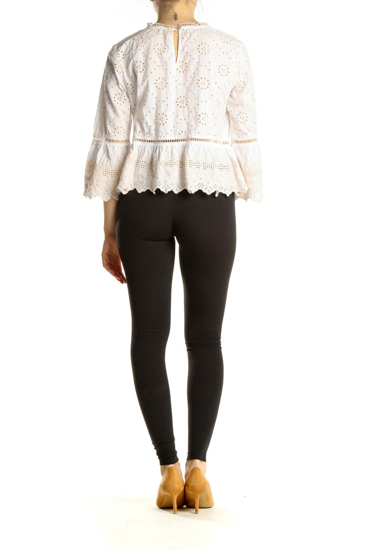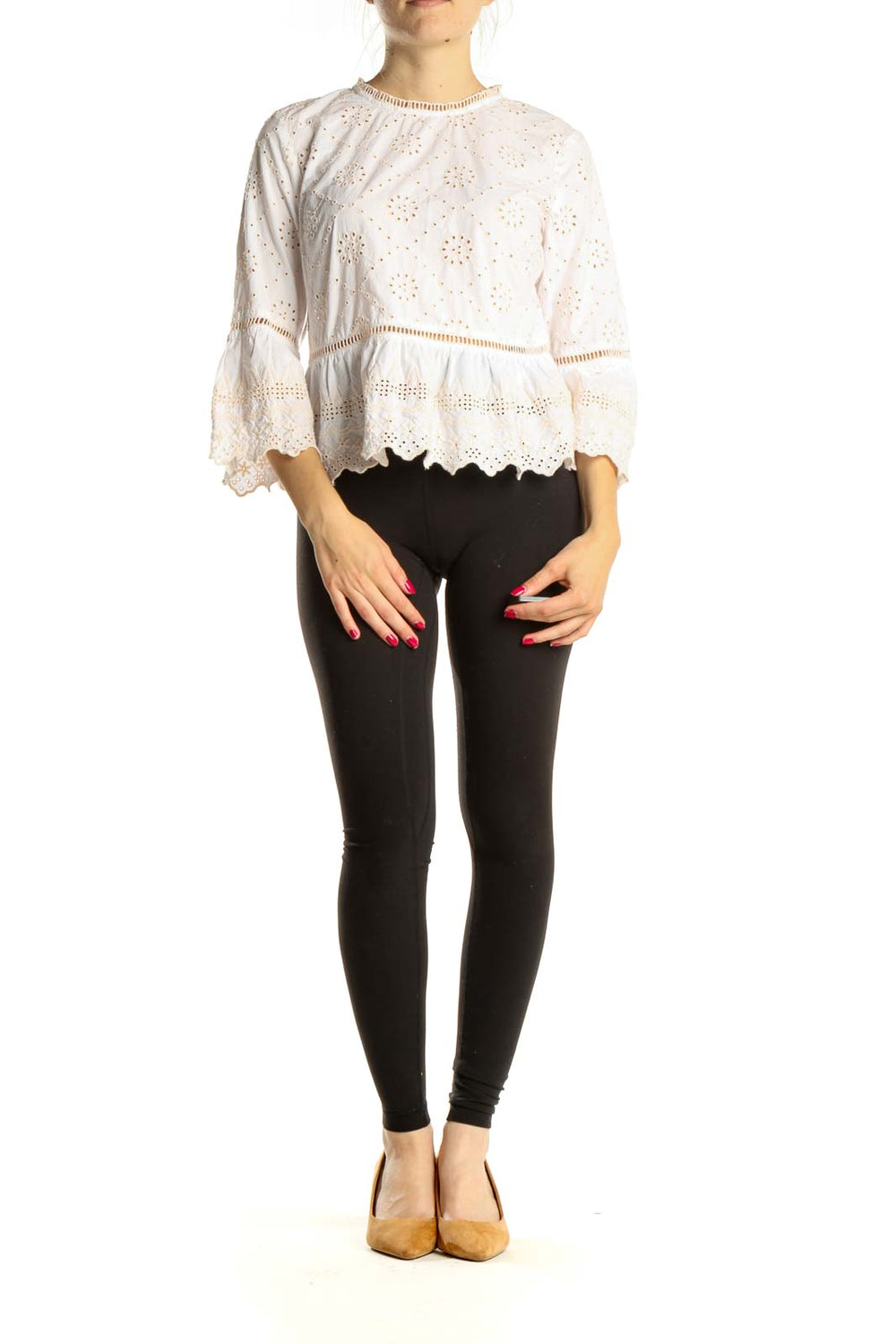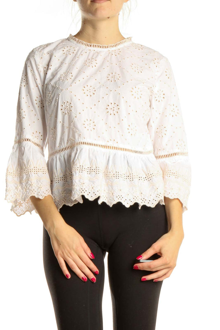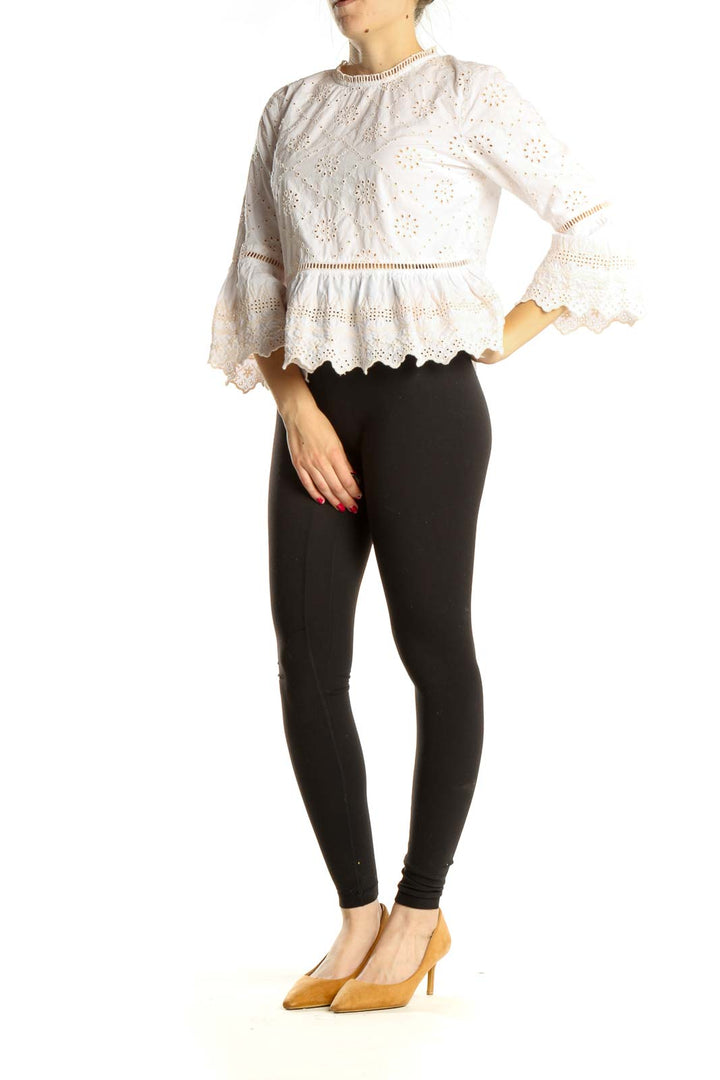 Elevate your summer wardrobe with this charming white eyelet lace crop top from Free People. This delightful piece features intricate floral eyelet patterns throughout, adding a touch of romantic femininity to your look. The bell sleeves with scalloped edges create a whimsical silhouette, perfect for warm-weather outings.
