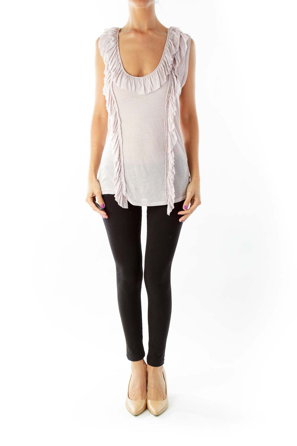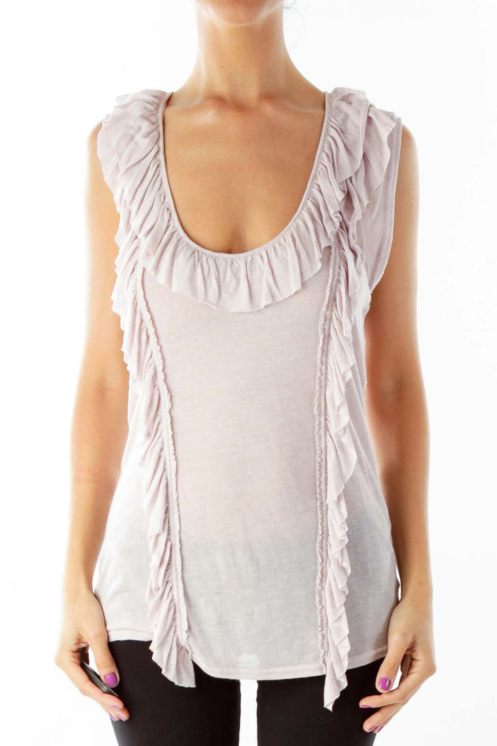 Elevate your casual wardrobe with this ethereal light pink sleeveless top from Free People. Featuring a scoop neckline adorned with delicate ruffles that cascade down the front, this top exudes a romantic and feminine charm. The soft, lightweight fabric drapes beautifully, creating a flattering silhouette that's perfect for warm weather or layering.