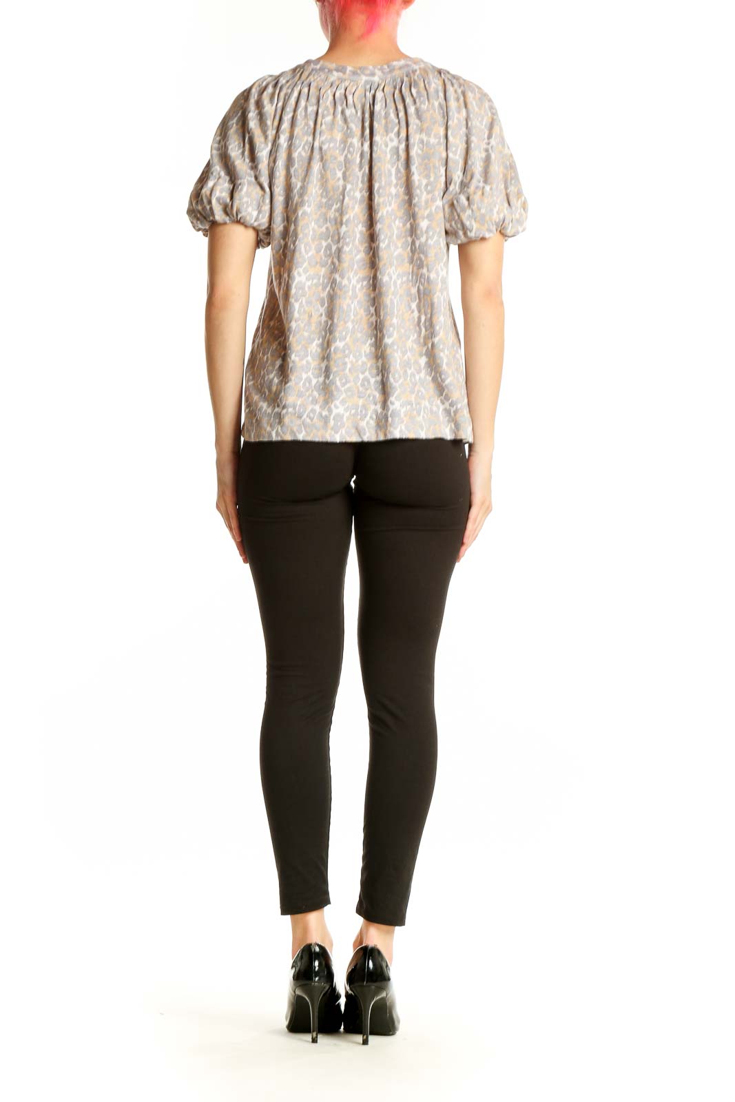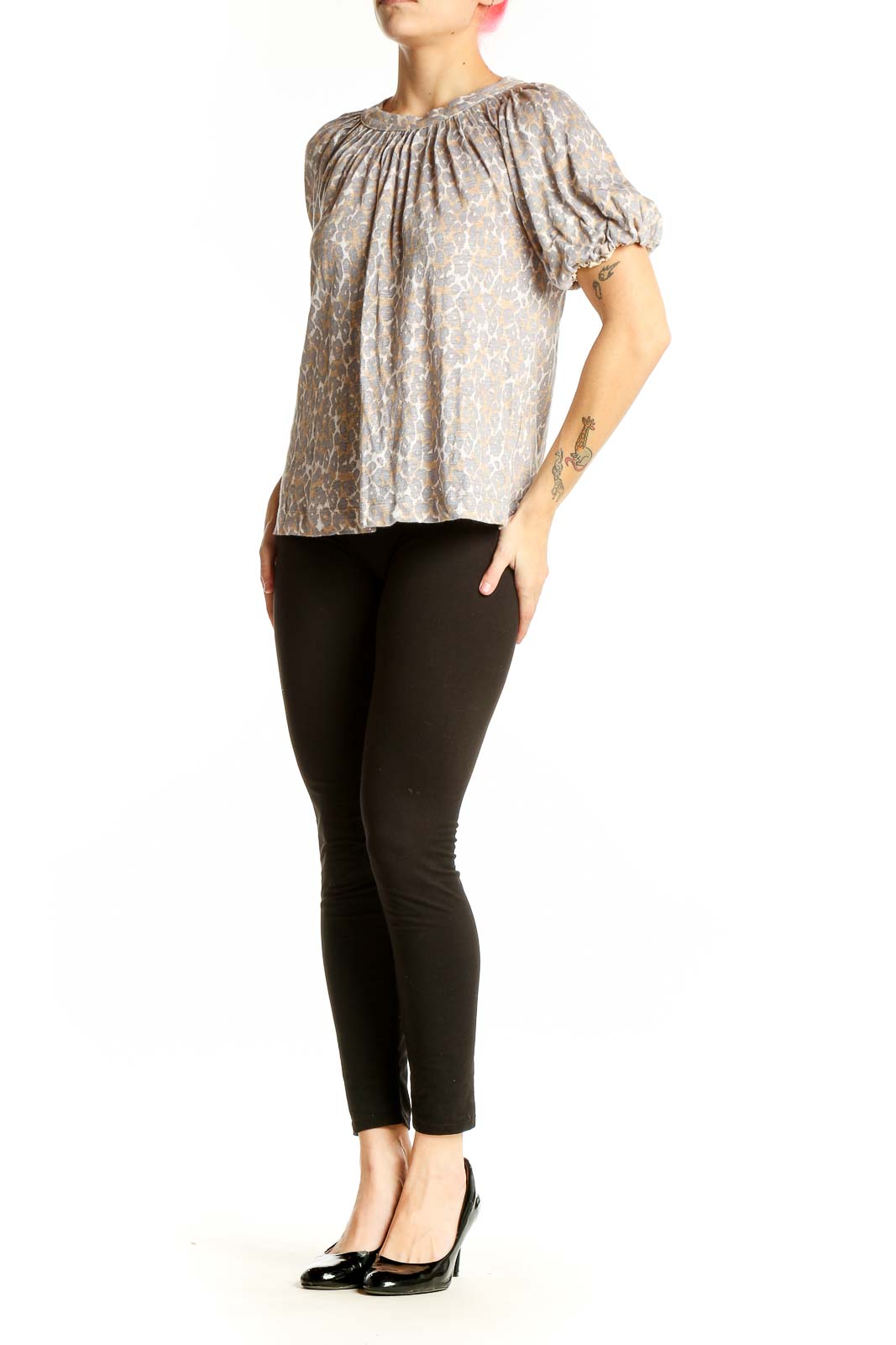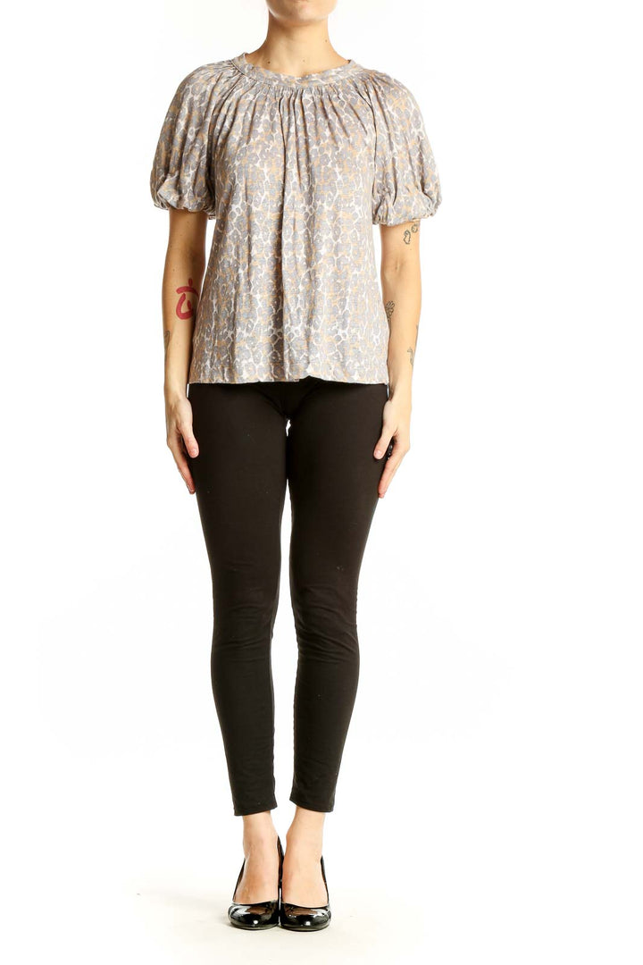 Beige Floral Puff Sleeve Linen Top