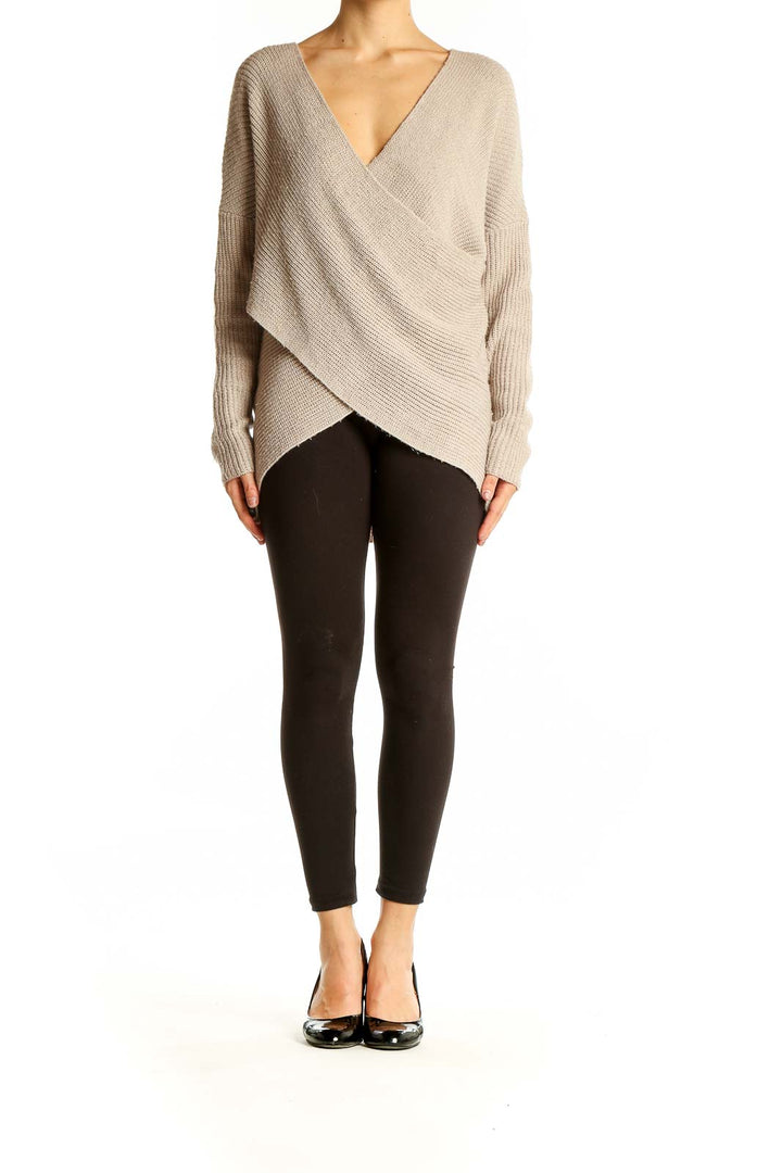 The ribbed cuffs and hem provide a polished finish, while the crossover front creates a flattering silhouette that drapes beautifully. With its versatile beige hue, this sweater easily pairs with any outfit, from casual jeans to sleek leggings. The excellent condition of this medium-sized piece ensures you'll enjoy its stylish comfort for seasons to come.