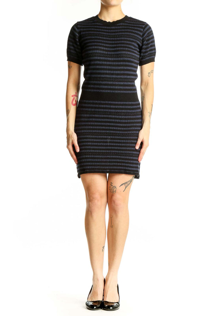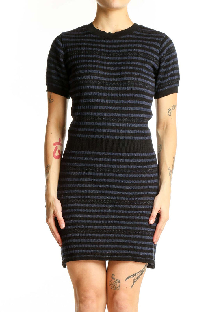 Elevate your casual-chic wardrobe with this stunning Black and Navy Striped Knit Dress from Zara Knit. This form-fitting dress showcases a classic horizontal stripe pattern in a sophisticated black and navy color combination, perfect for various occasions. Crafted from a comfortable blend of polyester and viscose, it offers both style and ease of wear.