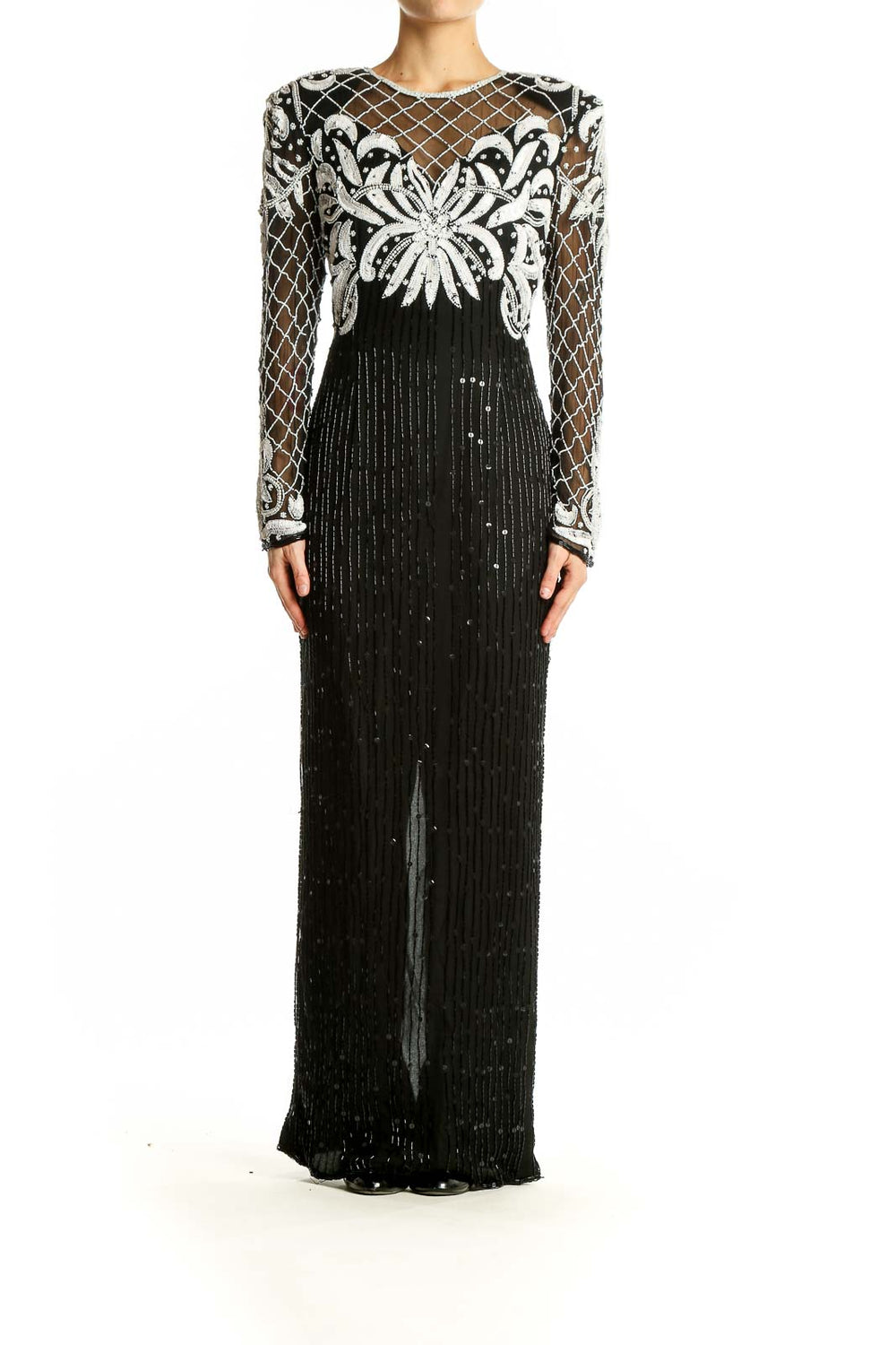 Front view of Lauren Kazan black and white embellished silk gown with intricate beadwork