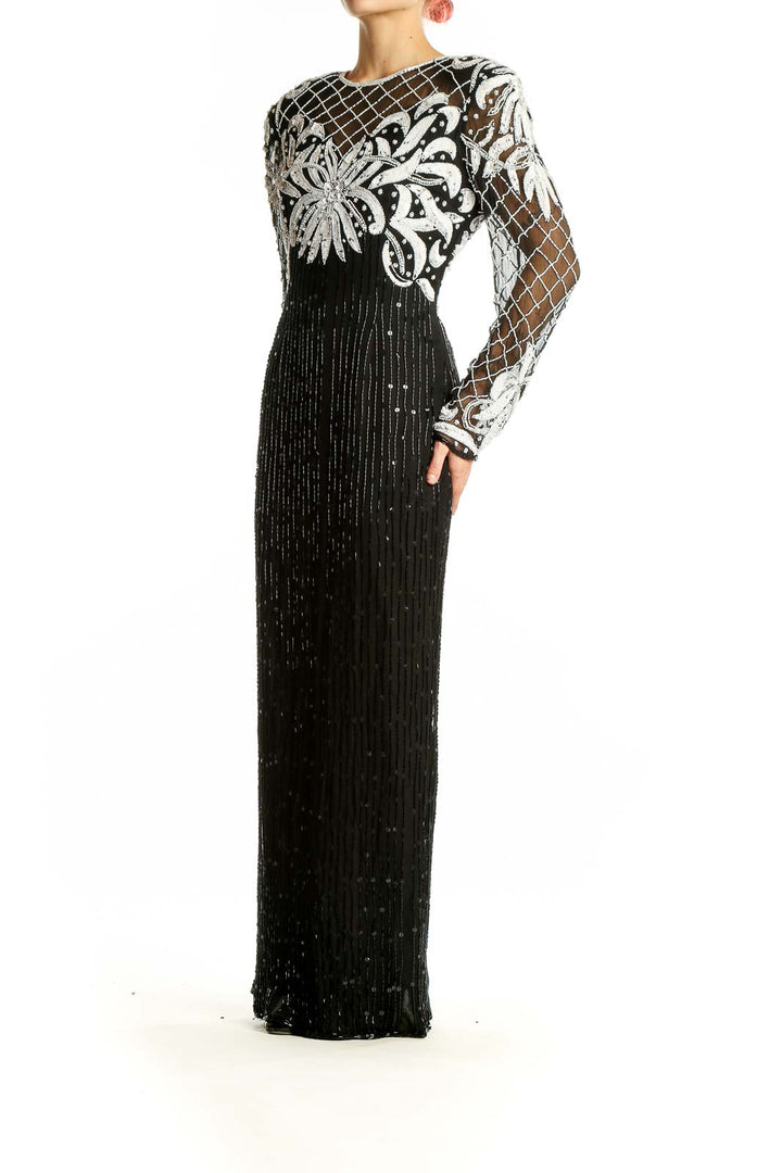 Make a stunning entrance in this exquisite black and white embellished silk gown by Laurence Kazar. This floor-length dress features a breathtaking design with intricate white beadwork forming an elegant floral pattern across the bodice and sheer long sleeves. The fitted silhouette gracefully flows into a sleek black skirt with subtle sparkle, creating a mesmerizing contrast. The sheer neckline and sleeves add a touch of allure, while the high-quality silk fabric ensures comfort and luxury. Perfect for formal events or red-carpet occasions, this gown combines timeless elegance with modern sophistication. In excellent condition, this size small dress is a true statement piece that will turn heads and leave a lasting impression.