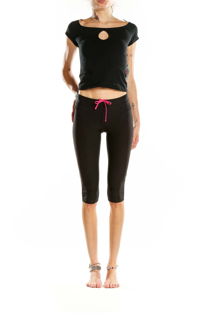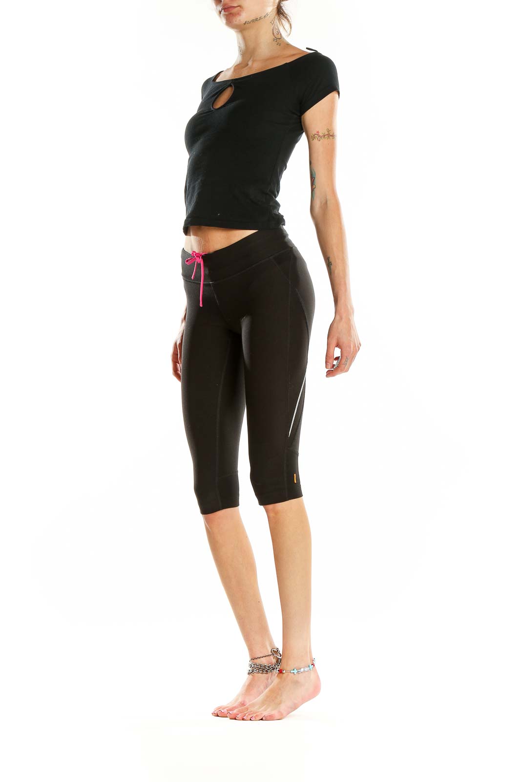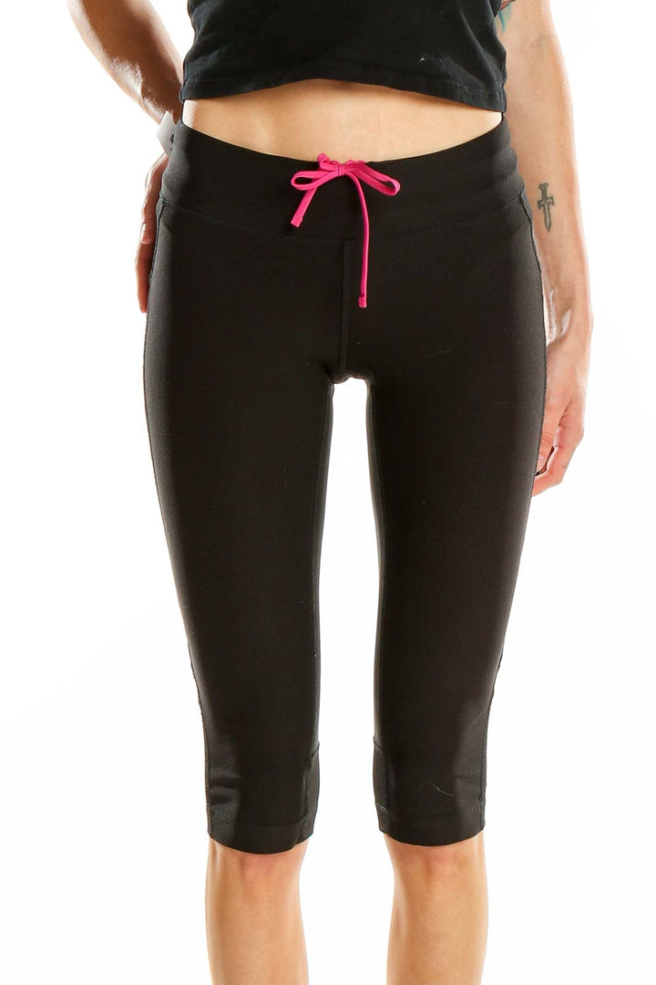 Featuring a trendy capri length that hits just below the knee, these leggings are perfect for yoga, running, or any high-intensity workout. The wide waistband with a playful pink drawstring adds a pop of color and ensures a secure, adjustable fit. The moisture-wicking fabric keeps you cool and dry, making these leggings ideal for even the most intense training sessions.