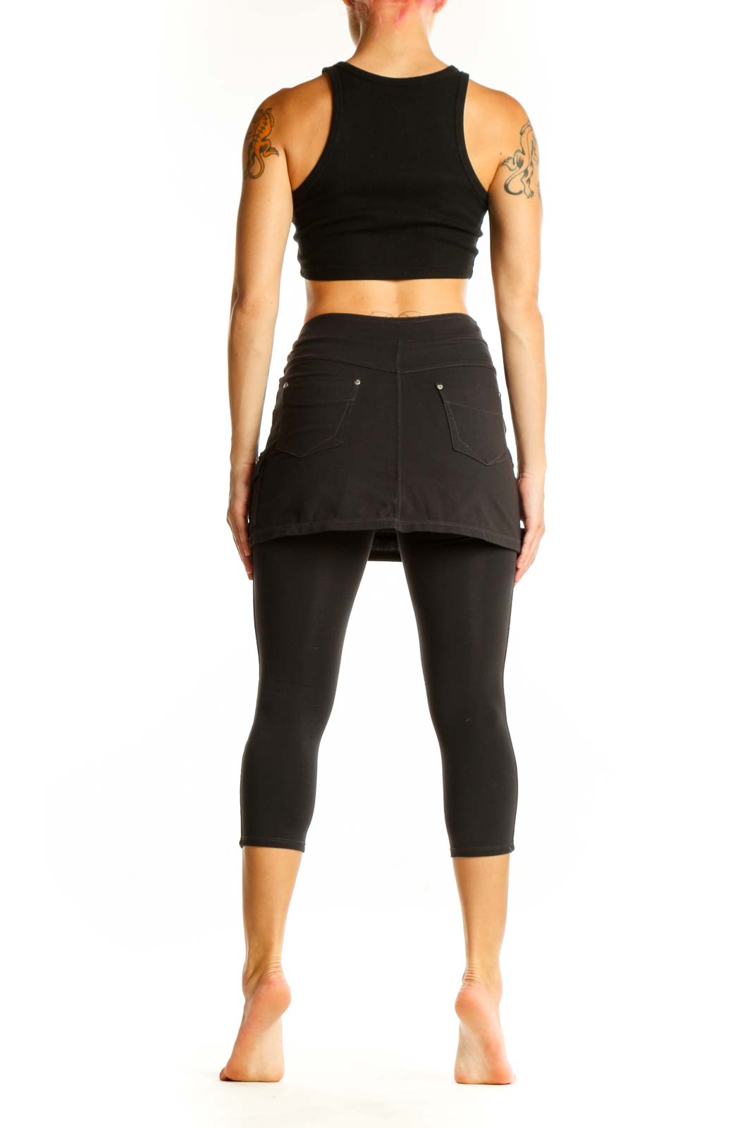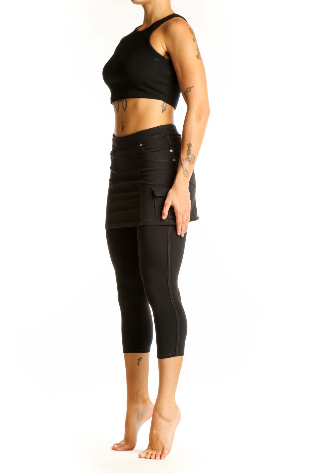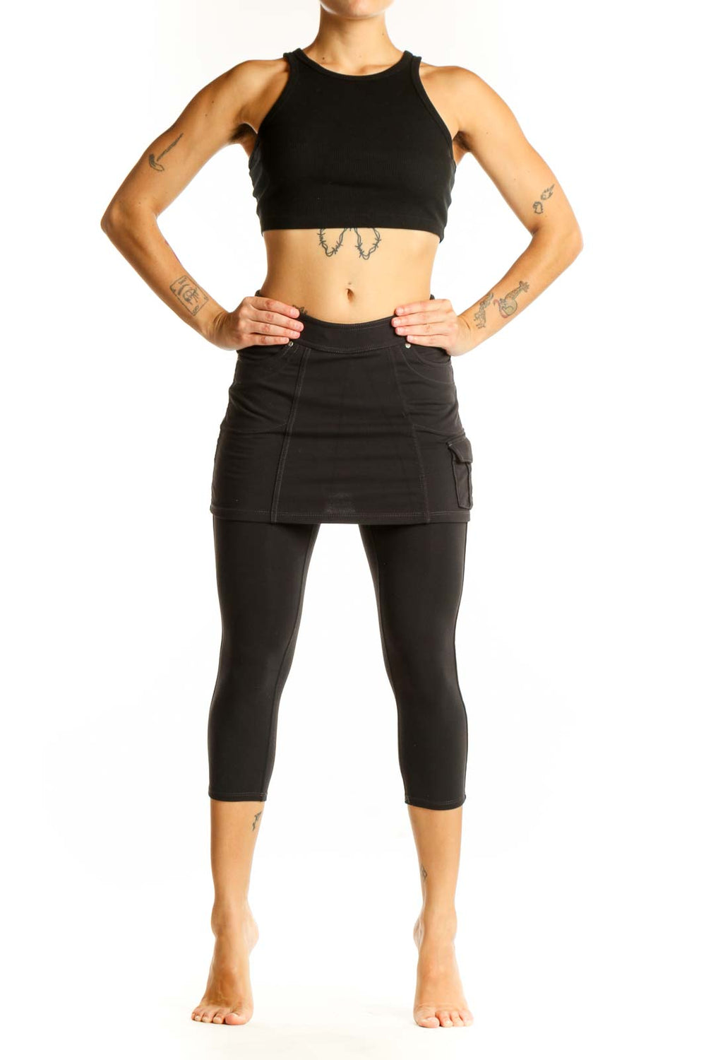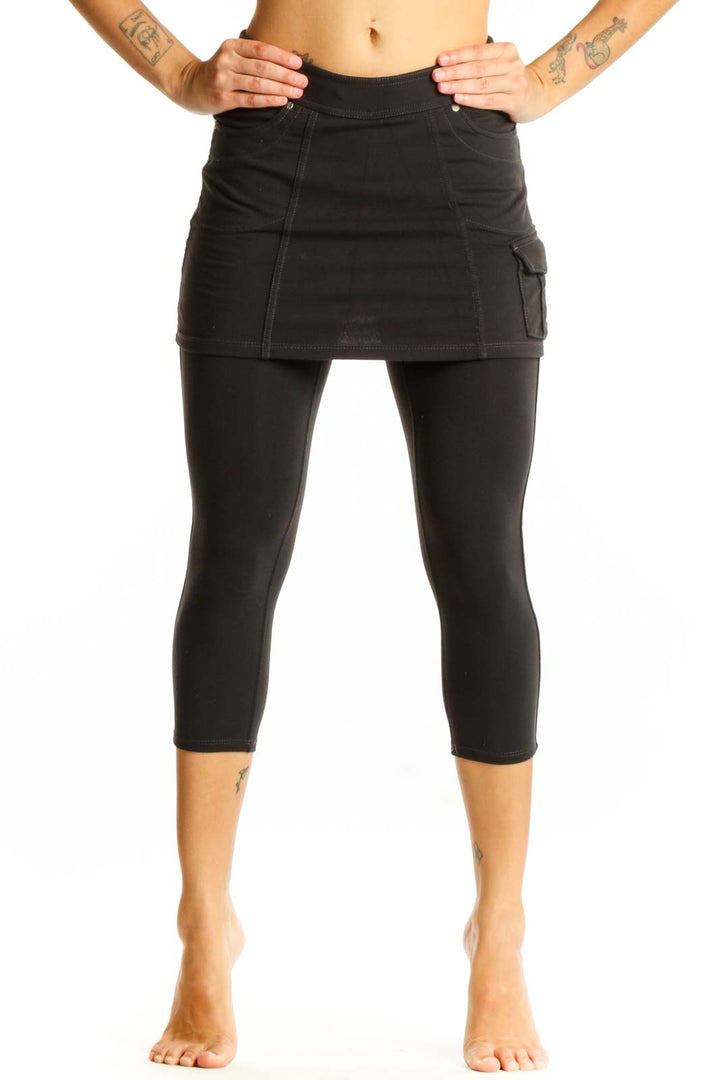 Elevate your athletic wardrobe with these versatile black skirted capri leggings from Athleta. Crafted from soft, breathable cotton, these leggings offer both comfort and style for your active lifestyle. The unique design features a flattering skirt overlay, providing extra coverage and a feminine touch to your workout attire.