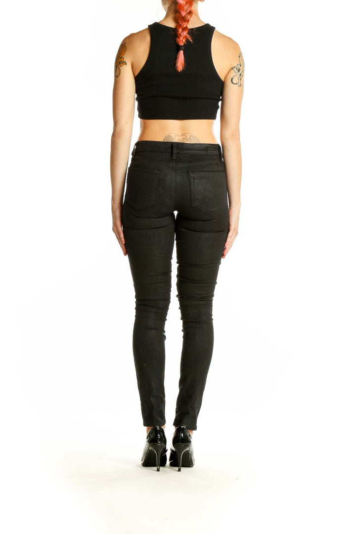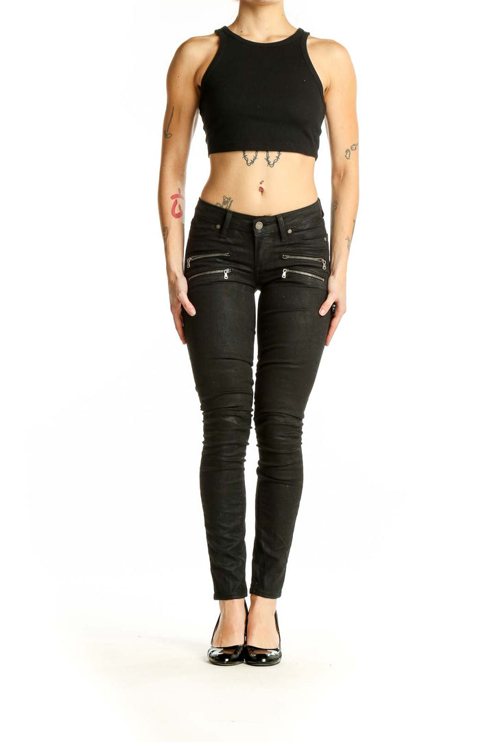 Make a bold statement with these sleek black skinny jeans from Paige. Crafted from a comfortable blend of cotton, elastane, lyocell, polyester, and rayon, these jeans offer both style and flexibility. The edgy design features multiple zipper details, adding a touch of urban flair to your look. With a low-rise waist and figure-hugging fit, these jeans accentuate your curves while providing all-day comfort. The versatile black color makes them perfect for both casual outings and night-time adventures. In good condition, these Paige jeans are a must-have addition to any fashion-forward wardrobe.
