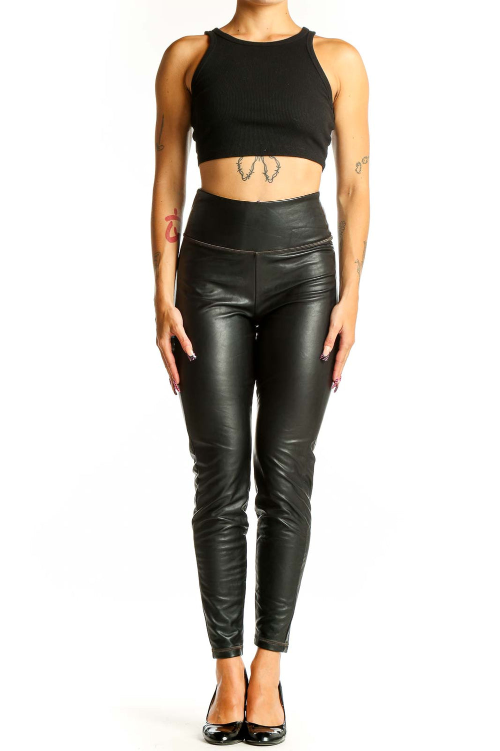Elevate your athleisure game with these sleek black faux leather leggings from Athleta. These high-waisted pants offer a perfect blend of style and comfort, ideal for both workouts and casual outings. The polyester-spandex blend provides a stretchy, figure-hugging fit that moves with you, while the faux leather finish adds a touch of edgy sophistication.