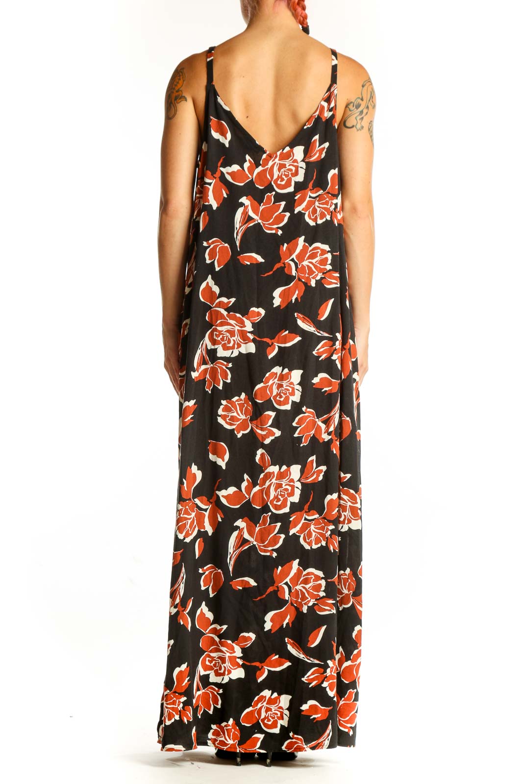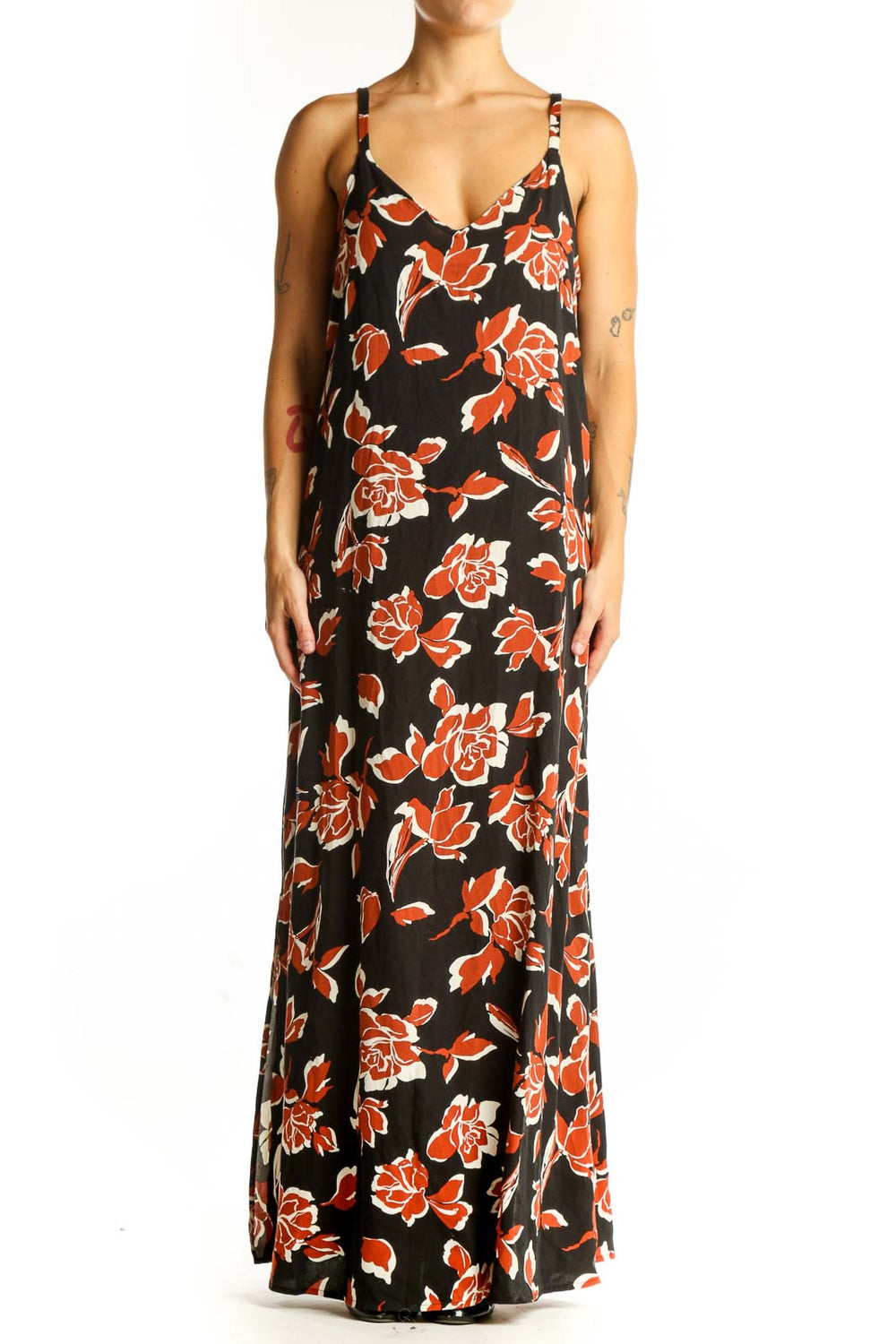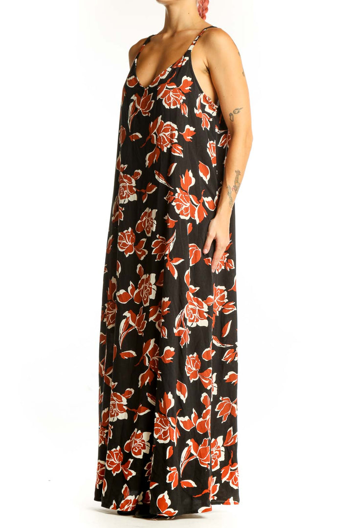 Make a statement with this stunning black maxi dress adorned with vibrant orange floral prints. The Vince Camuto creation features a flattering V-neckline and thin spaghetti straps, perfect for showcasing your shoulders. The flowing silhouette gracefully drapes to the floor, creating an elegant and feminine look.