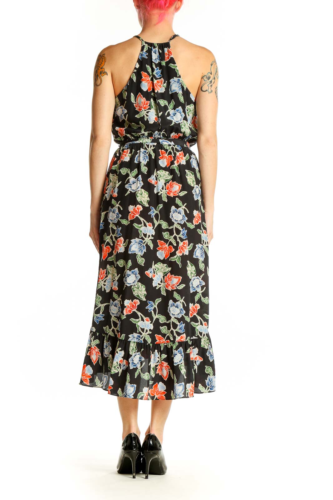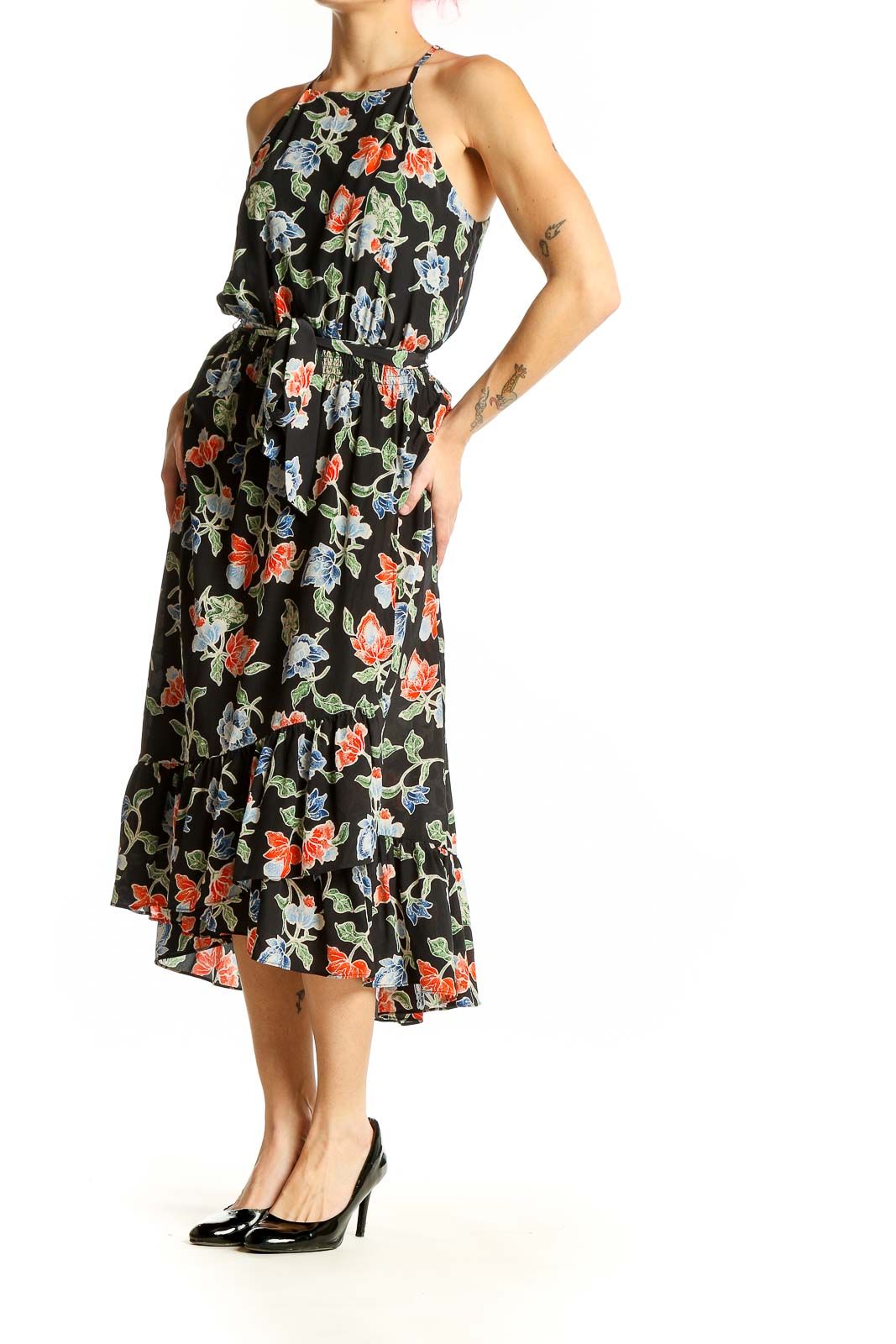 Elevate your wardrobe with this stunning black floral silk midi dress from Joie. The halter neckline and sleeveless design offer a graceful, feminine silhouette perfect for warm-weather occasions. Crafted from luxurious silk, this dress features a vibrant print of red and blue flowers with green leaves, creating a striking contrast against the black background. The elastic waistband ensures a comfortable, flattering fit, while the flowy skirt with a subtle high-low hem adds movement and charm. Ideal for both daytime events and evening soirées, this versatile piece can be easily dressed up or down. In excellent condition, this Joie dress is a timeless addition to any fashion-forward wardrobe.