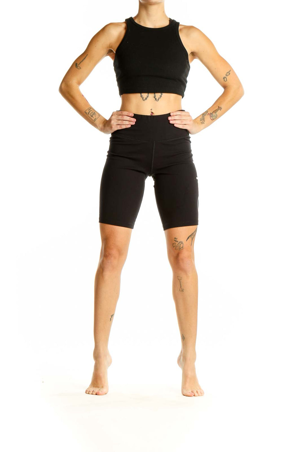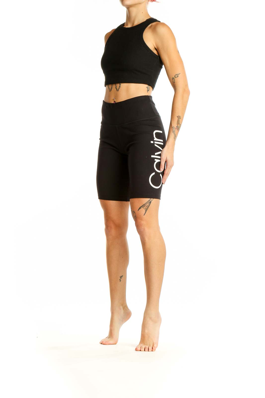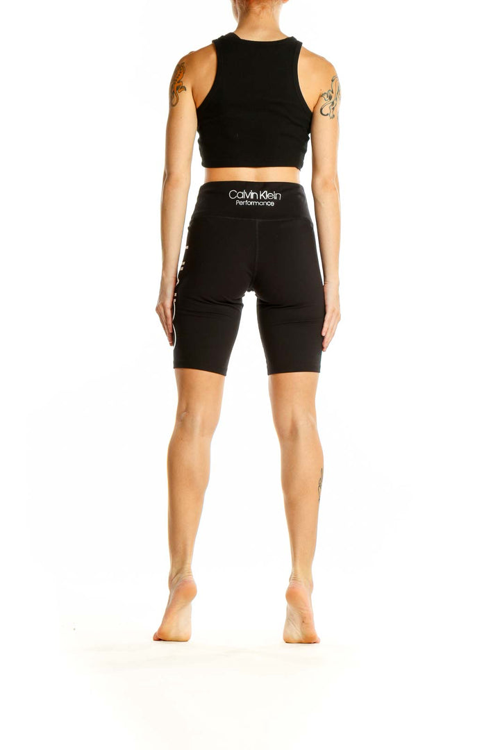Elevate your workout wardrobe with these sleek black high-waisted bike shorts from Calvin Klein Performance. Crafted from a premium blend of polyester and spandex, these shorts offer the perfect balance of comfort and flexibility for your most intense training sessions. The high-waisted design provides excellent tummy control and a flattering silhouette, while the mid-thigh length offers ample coverage and prevents riding up during exercise. With a smooth, second-skin feel, these shorts wick away moisture to keep you cool and dry. The side panel features a stylish Calvin Klein logo, adding a touch of brand prestige to your athletic ensemble. In excellent condition, these versatile shorts are a must-have addition to any fitness enthusiast's wardrobe.