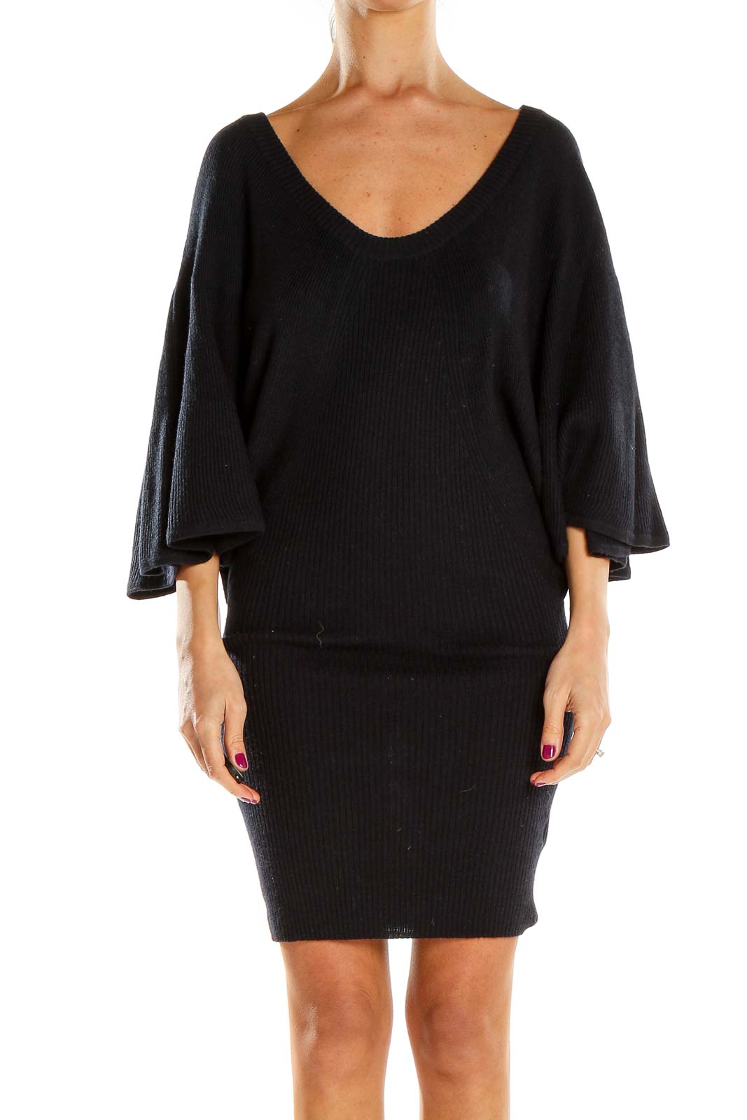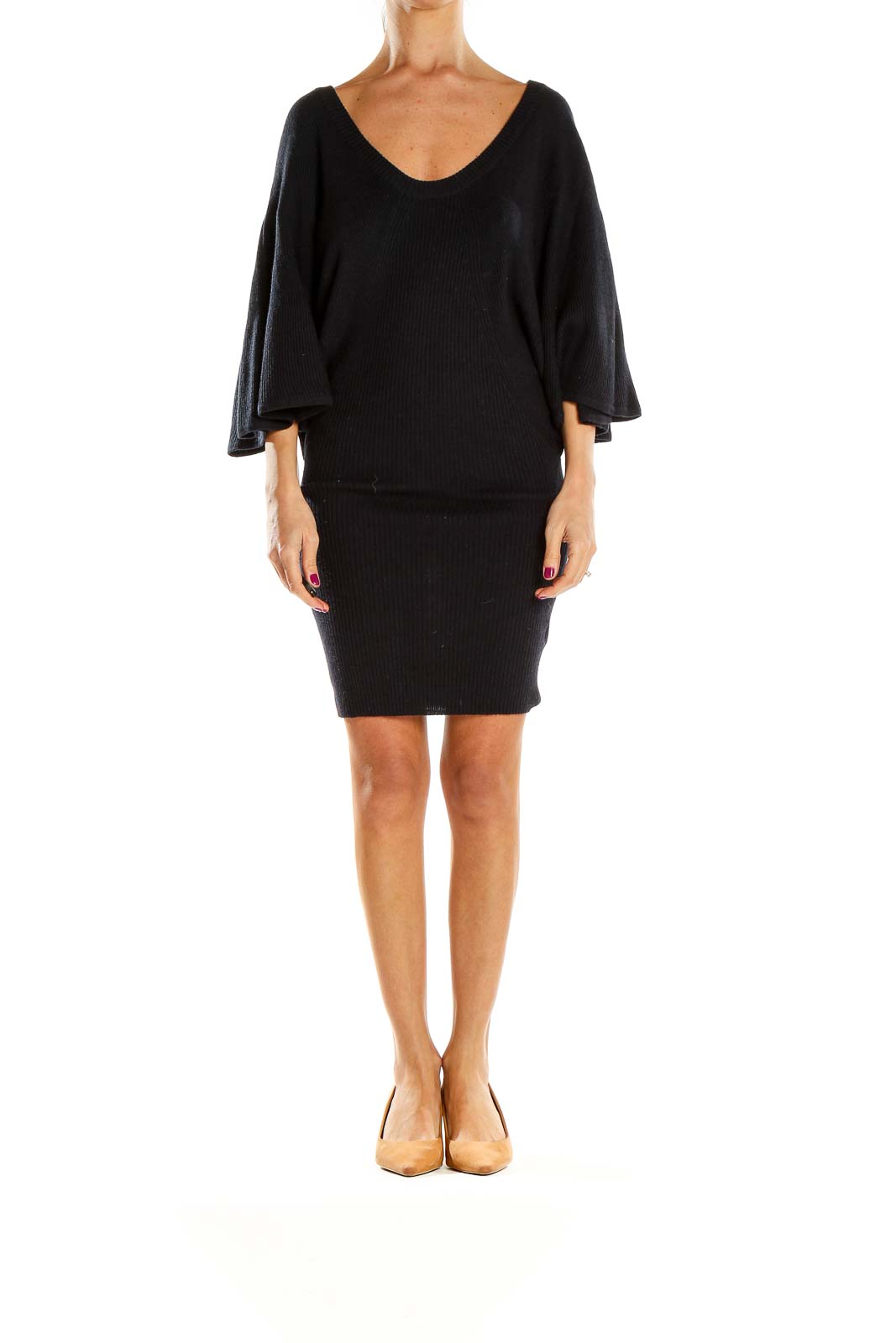 Make a statement with this elegant black ribbed knit dress from French Connection. The form-fitting silhouette beautifully accentuates your curves, while the dramatic batwing sleeves add a touch of sophistication and flair. The deep V-neckline creates a flattering focal point, perfect for showcasing your favorite necklace.