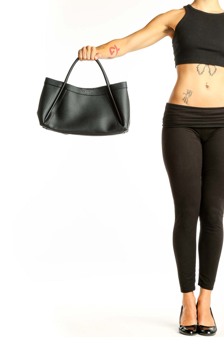 Model wearing black NEWBELLA leather shoulder bag with all-black outfit