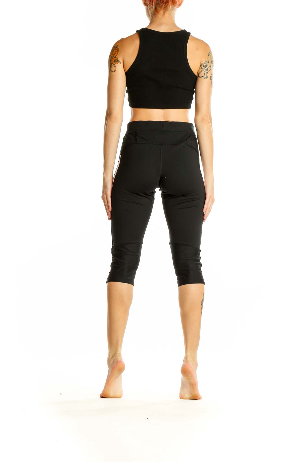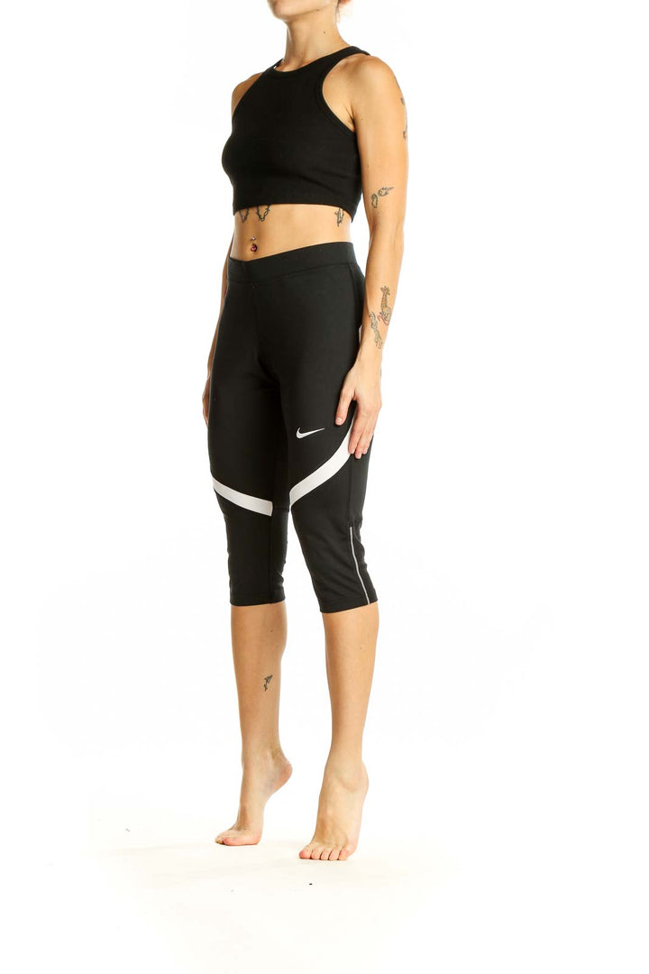 Elevate your workout wardrobe with these sleek black Nike performance capri leggings. Featuring a striking white stripe detail, these leggings offer both style and functionality for your active lifestyle. The polyester-spandex blend ensures a comfortable, stretchy fit that moves with you during any activity. With a mid-rise waistband and a capri length that hits just below the knee, these leggings provide excellent coverage and support. The moisture-wicking fabric keeps you cool and dry, making them perfect for intense workouts or casual wear. In excellent condition, these Nike capris are a versatile addition to any fitness enthusiast's wardrobe.