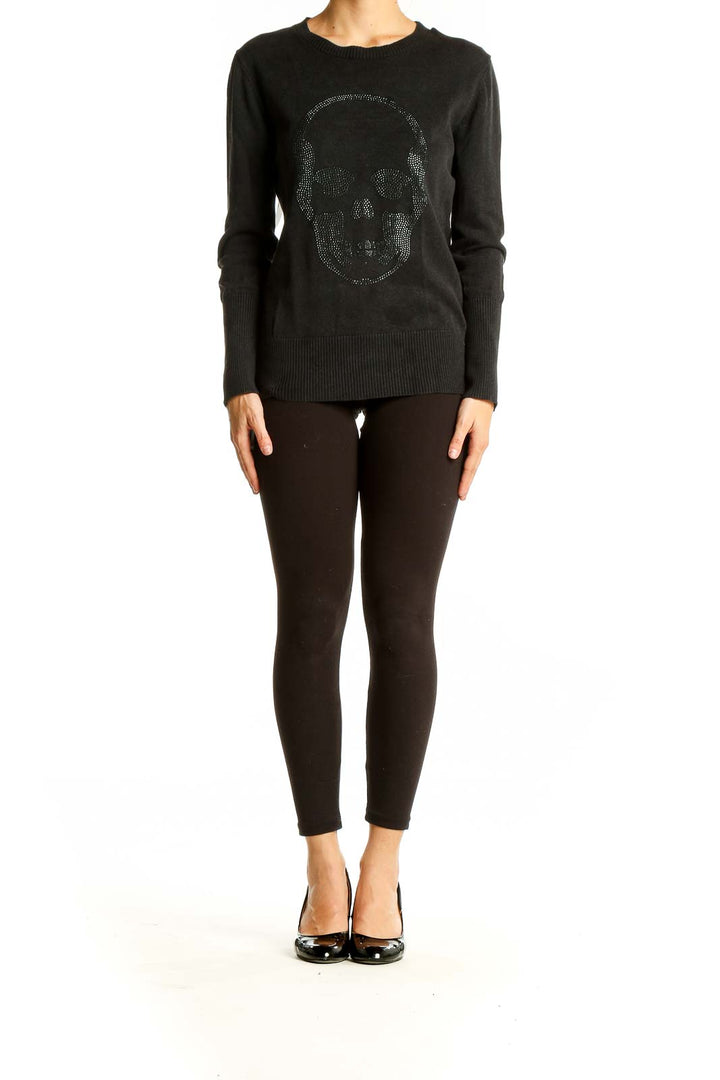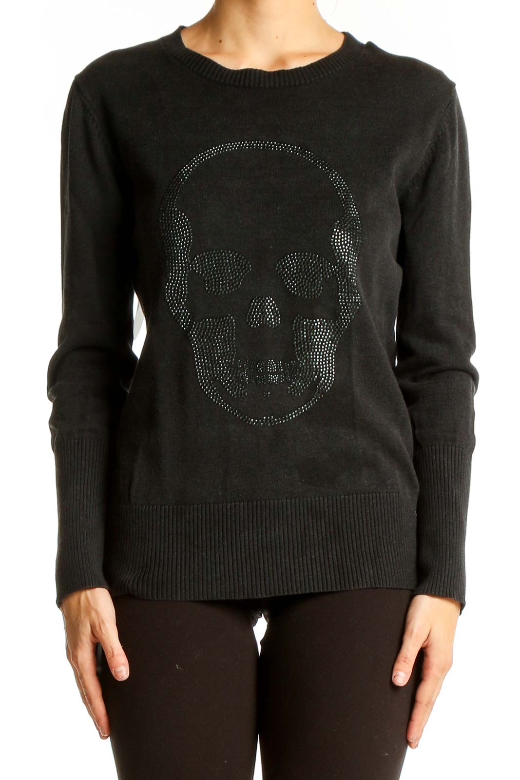 Make a bold statement with this edgy black knit sweater from SilkRoll. Featuring a striking skull design embellished with shimmering studs on the front, this piece effortlessly combines comfort with a touch of rock-chic style. The soft, stretchy fabric ensures a comfortable fit, while the ribbed crew neckline and cuffs add a classic touch. Perfect for those who love to stand out, this sweater pairs beautifully with jeans or leather pants for a complete look that's both cozy and cool. In excellent condition, this size small sweater offers versatility for various occasions, from casual outings to edgy night-time looks.
