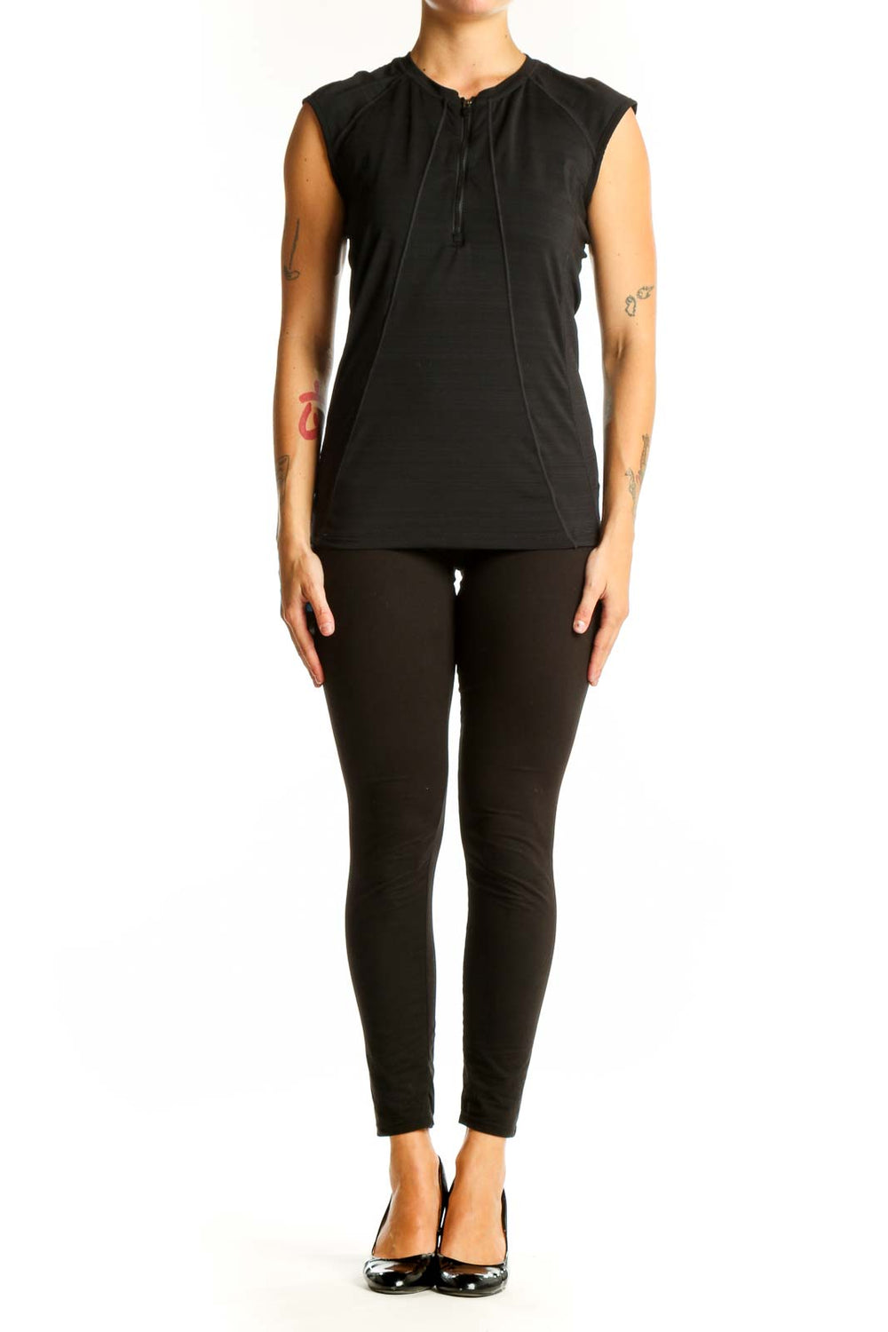 Elevate your workout wardrobe with this sleek black athletic top from Athleta. Crafted from a high-performance blend of polyester and spandex, this top offers both comfort and flexibility for your most intense training sessions. The sleeveless design provides unrestricted arm movement, while the half-zip front allows for easy ventilation control.