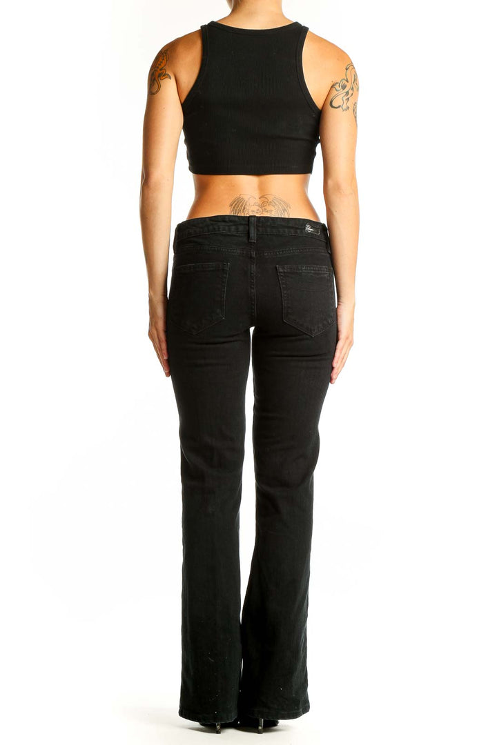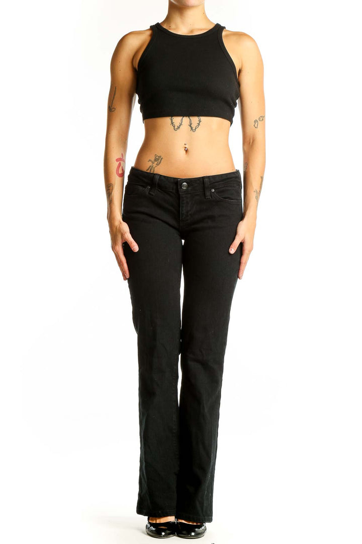 Step out in style with these sleek black bootcut jeans from Paige. Crafted from a comfortable cotton-spandex blend, these jeans offer the perfect balance of stretch and structure. The slim fit through the hips and thighs flares subtly at the knee, creating a flattering silhouette that elongates your legs. With a mid-rise waist and a 39-inch length, these jeans are ideal for pairing with heels or boots. The classic five-pocket design and subtle branding add a timeless touch to these versatile pants. In good condition, these Paige jeans are a wardrobe staple that will take you from day to night with ease.