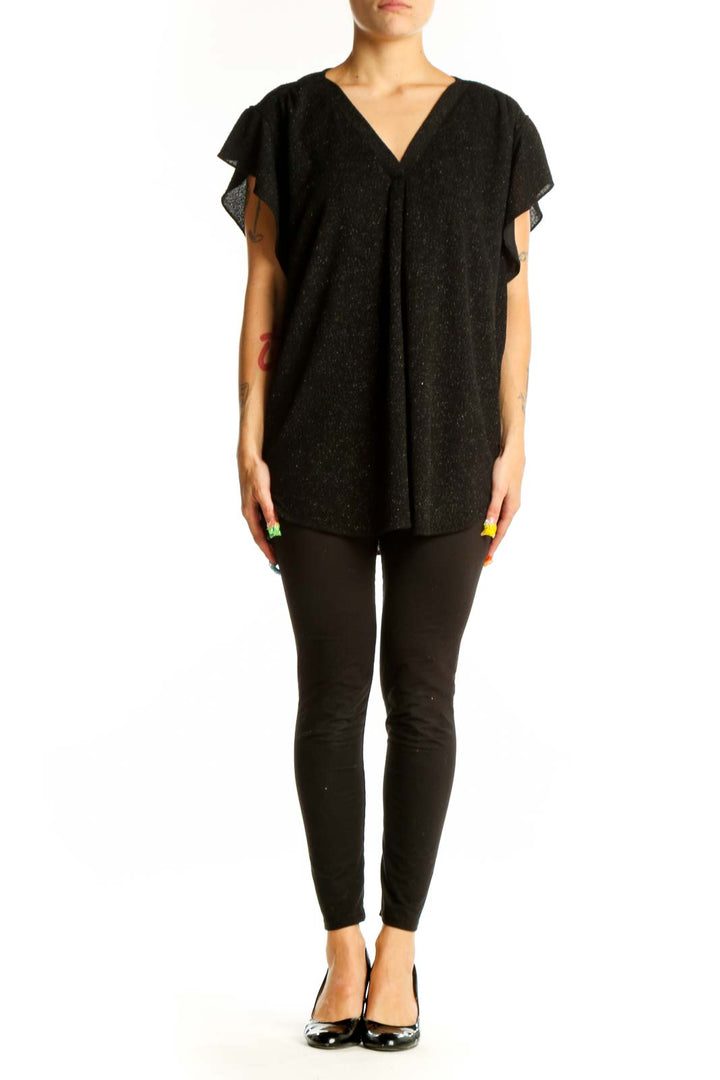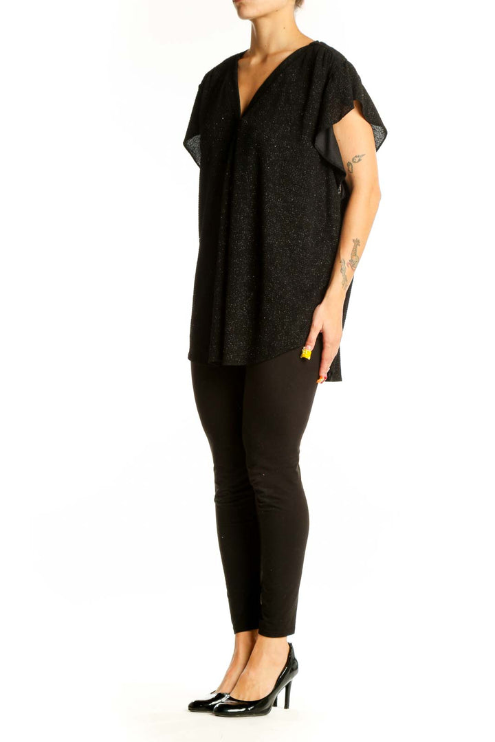 Elevate your wardrobe with this stunning black sparkly top from Vince Camuto. This elegant piece features a flattering V-neckline and charming flutter sleeves, adding a touch of feminine flair to your look. The shimmering fabric catches the light beautifully, making it perfect for evening events or special occasions.