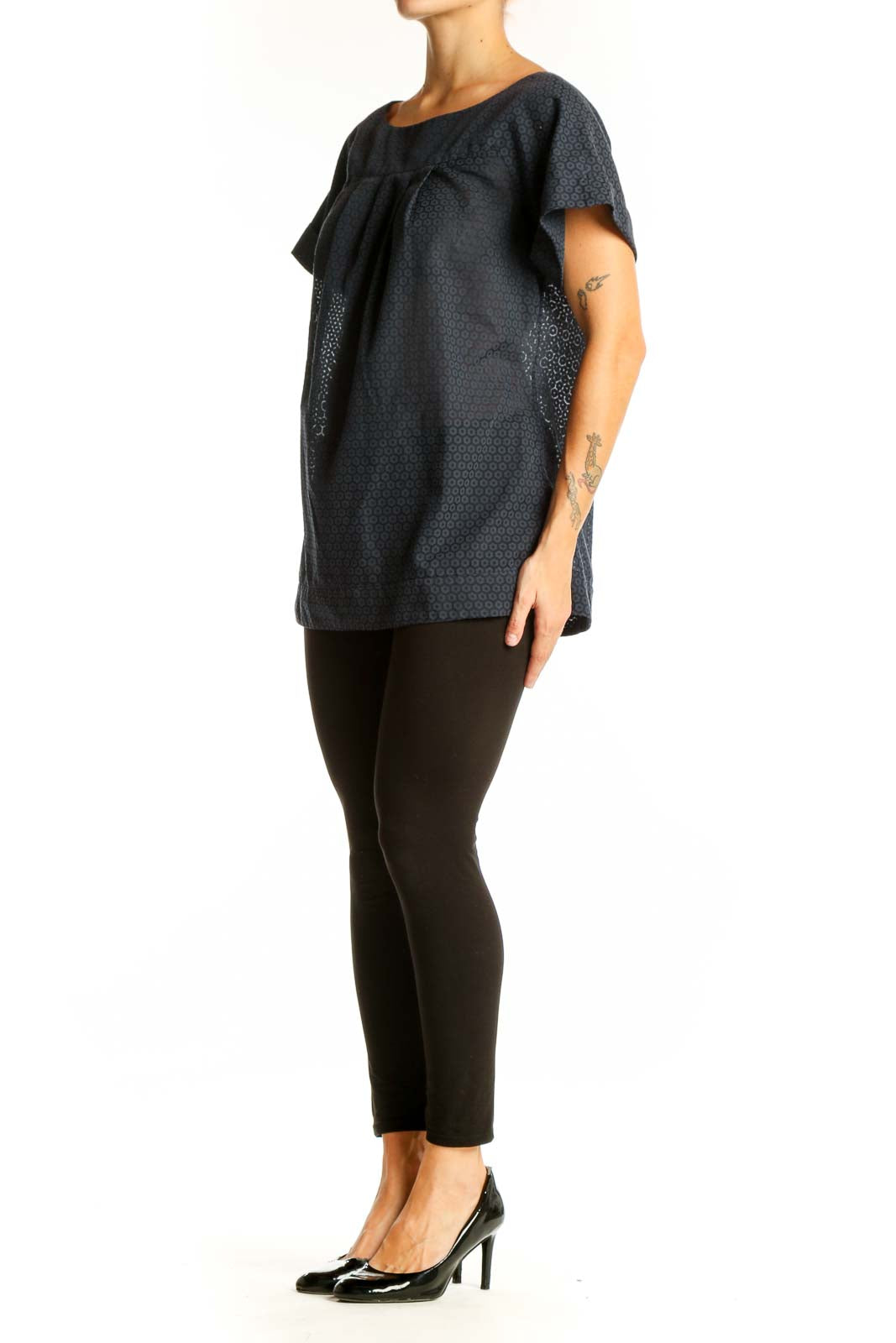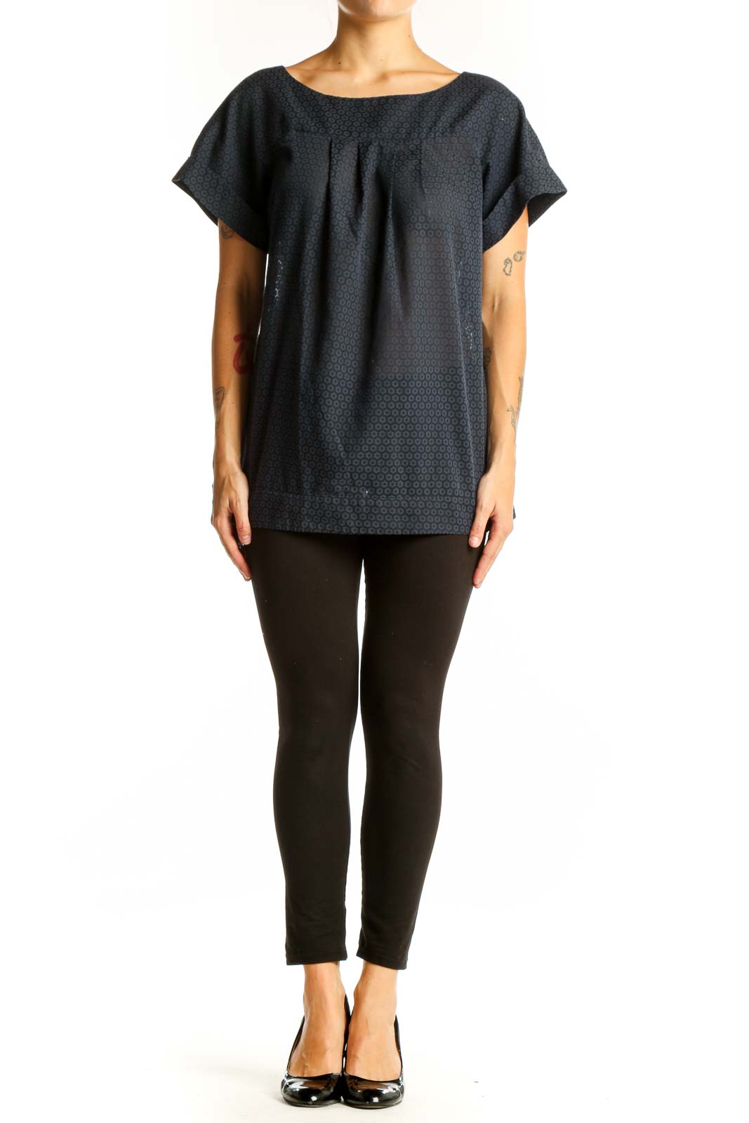 The top's excellent condition speaks to its quality and durability. With its versatile style, it can easily transition from day to night, making it a perfect addition to your wardrobe. The pleated detail at the neckline adds a touch of elegance, while the loose-fitting body ensures all-day comfort.