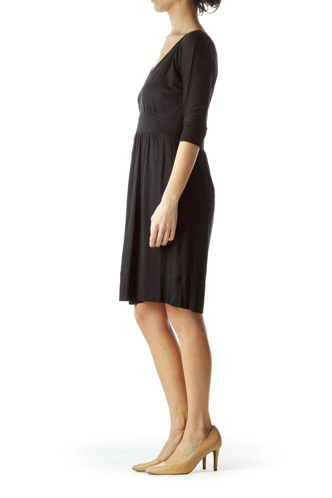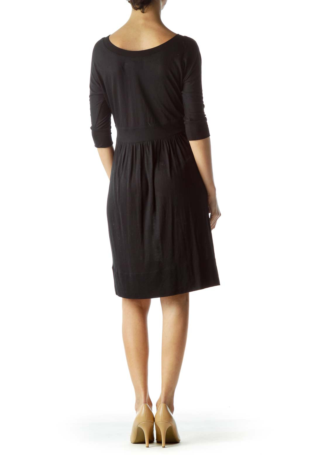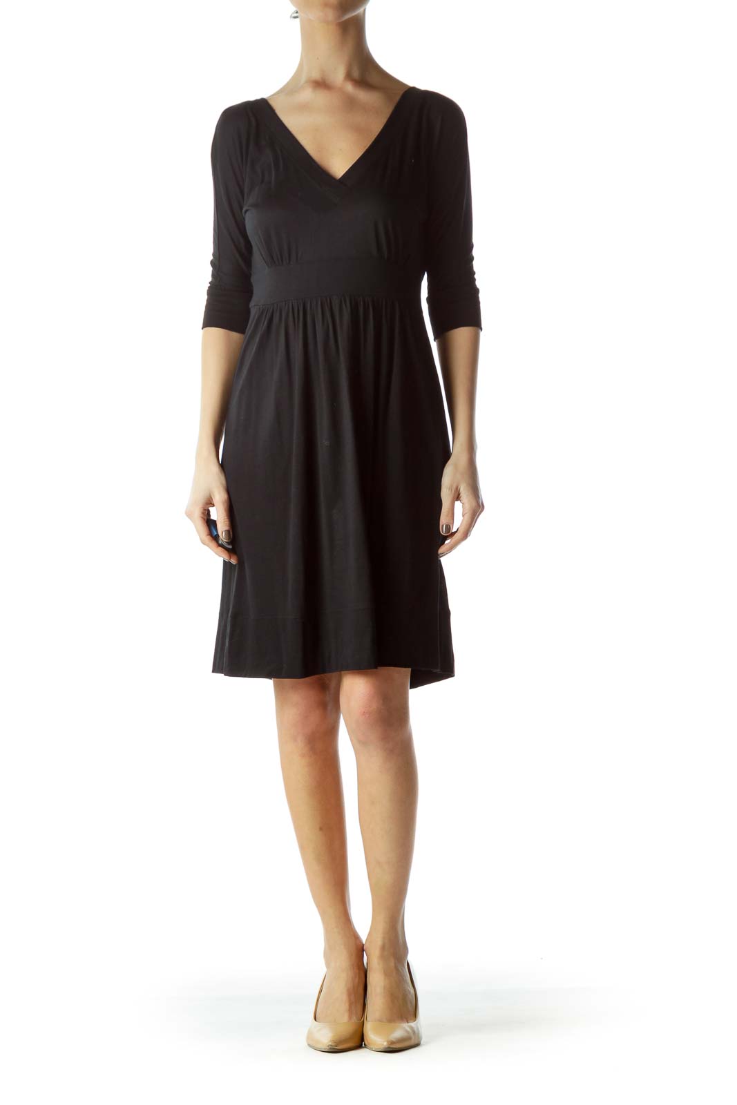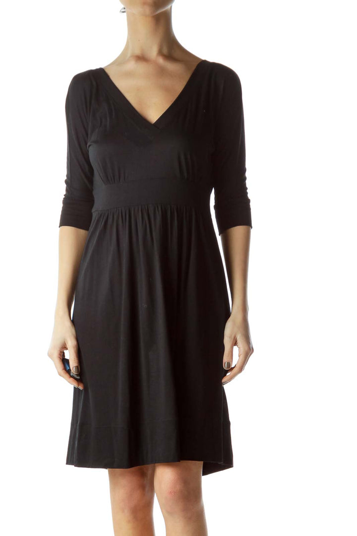Elevate your wardrobe with this elegant black dress from Juicy Couture. The flattering V-neckline and empire waist create a timeless silhouette that's perfect for various occasions. Crafted from a soft, stretchy fabric, this dress offers both comfort and style. The 3/4 length sleeves add a touch of sophistication, making it suitable for both day and evening wear. The dress falls to a versatile knee length, allowing for easy styling with your favorite accessories. In excellent condition, this Juicy Couture piece is a must-have for any fashion-forward woman looking for a versatile and chic addition to her closet.