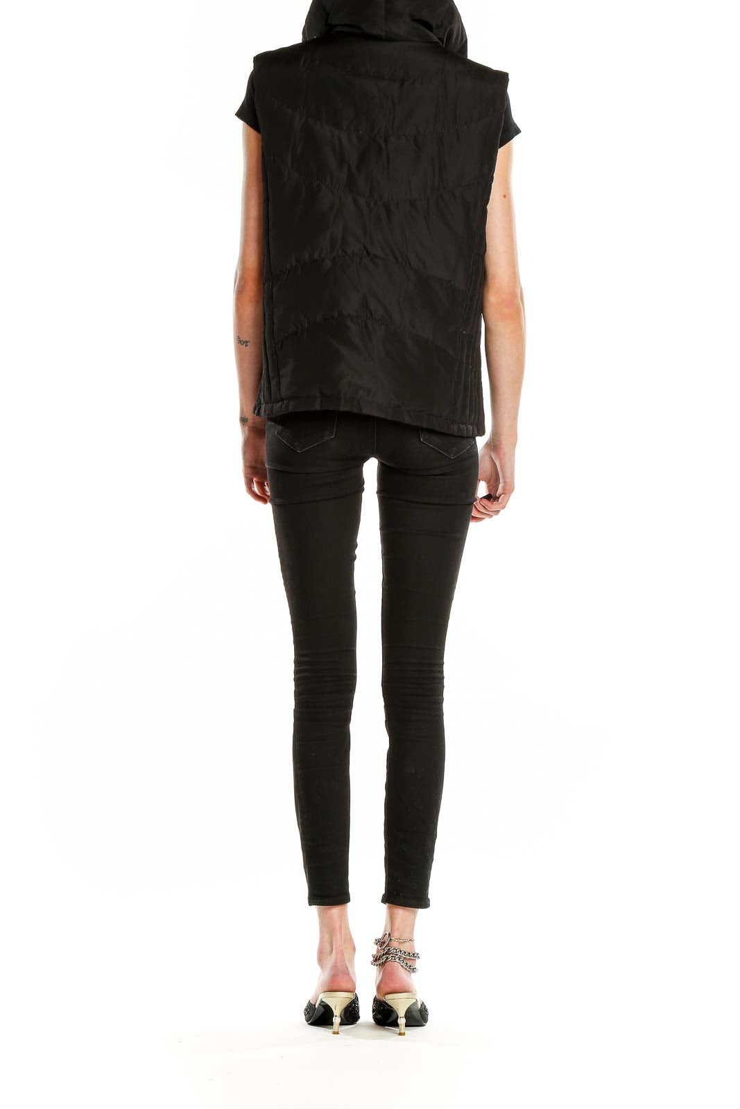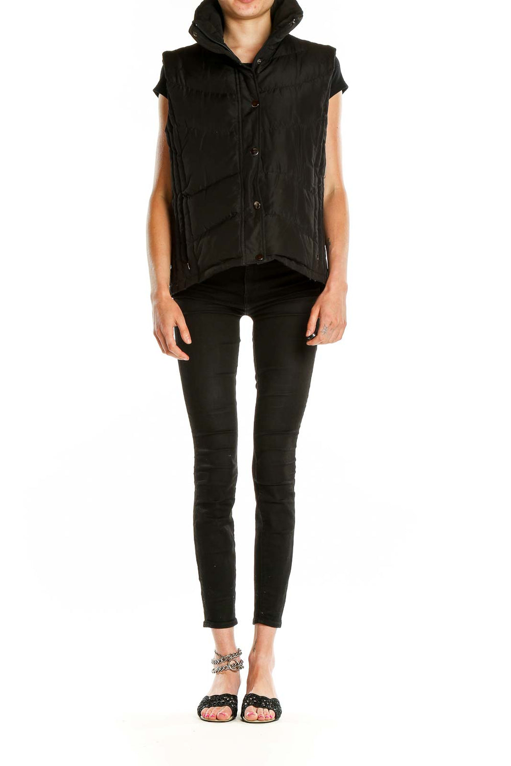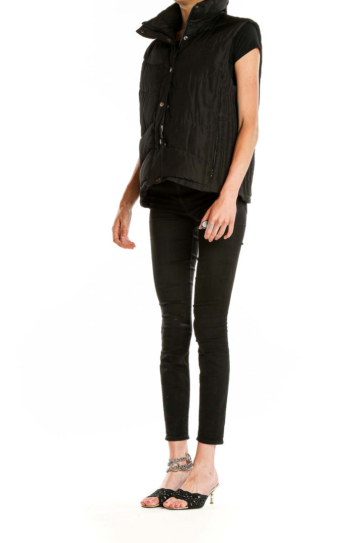 Stay warm and stylish with this sleek black quilted puffer vest from Kenneth Cole Reaction. Perfect for layering, this versatile piece features a high collar for added protection against the elements and a flattering silhouette that complements any outfit. The quilted design not only adds visual interest but also provides excellent insulation. Snap-button closures down the front allow for easy on and off, while the slightly longer back hem offers extra coverage. In good condition, this vest is a practical and fashionable addition to your cold-weather wardrobe. With its generous fit and measurements of 44" bust and 25" length, it's designed to accommodate layers underneath without sacrificing comfort or style.