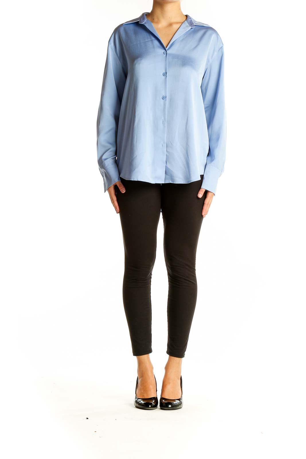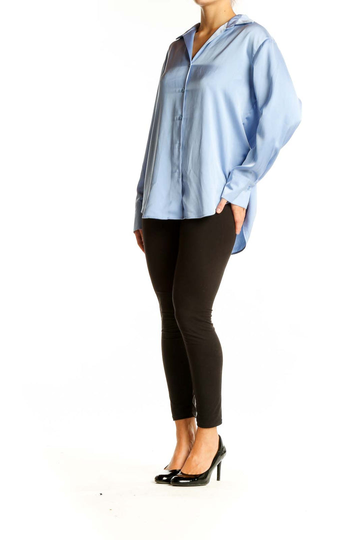 Elevate your wardrobe with this sophisticated light blue button-down shirt from Uniqlo. Crafted from smooth polyester, this top offers both comfort and style for any occasion. The relaxed fit and long sleeves provide a versatile look that can be dressed up or down.
