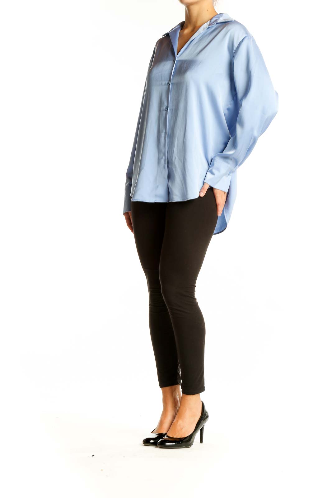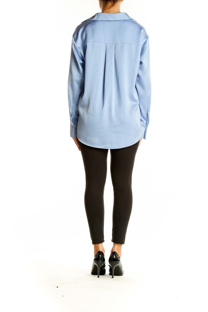 Featuring a classic collar and a full-length button placket, this shirt exudes timeless elegance. The light blue hue is perfect for creating a fresh, polished appearance. The back of the shirt showcases a subtle pleat detail, adding a touch of refinement to its design.