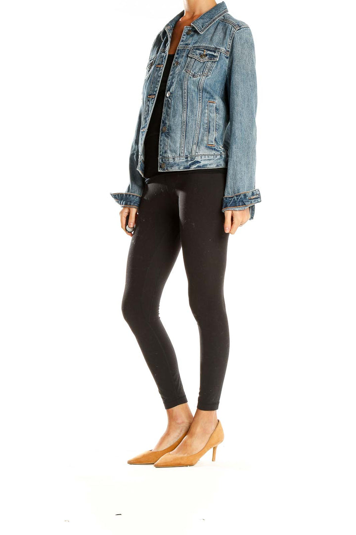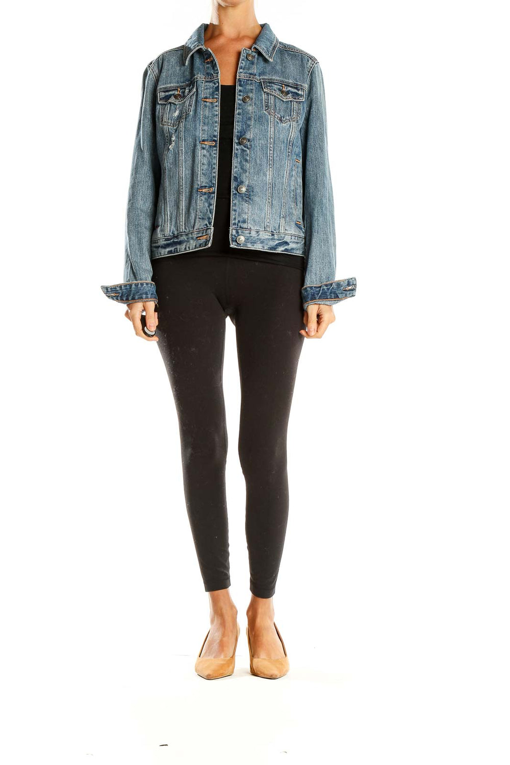 Crafted from high-quality denim, this jacket offers both durability and comfort. It features a traditional collar, button-up front, and functional chest pockets, embodying the quintessential denim jacket style. The fitted silhouette flatters the figure while allowing room for layering.