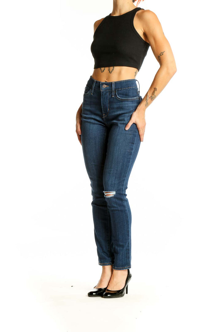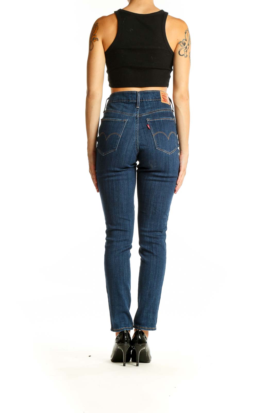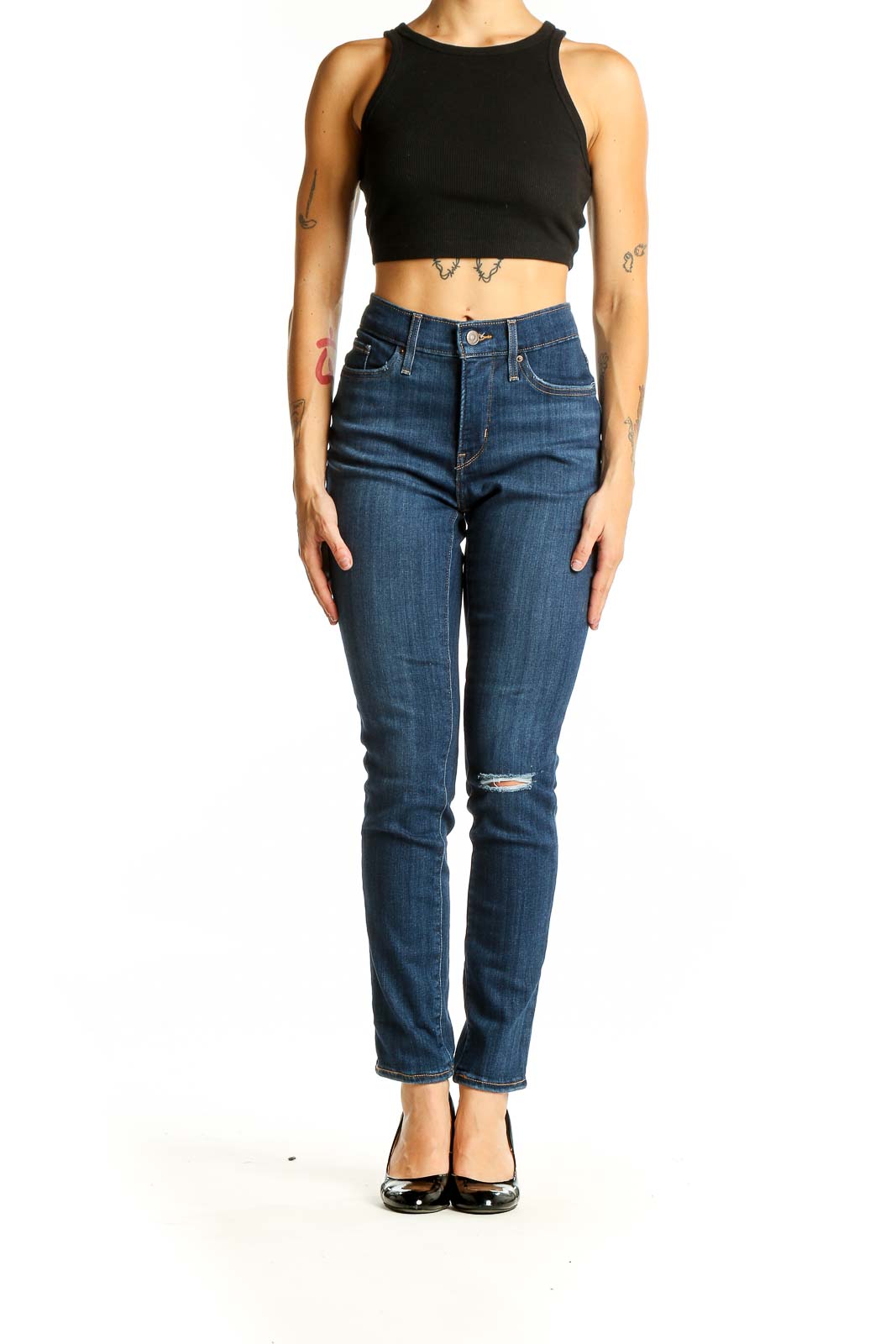 Step out in style with these classic blue skinny jeans from Levi's. Crafted from a comfortable blend of cotton, elastane, polyester, and viscose, these jeans offer both durability and stretch for all-day wear. The medium wash denim features subtle distressing at the knee, adding a touch of edgy charm to your look. With a high-rise waist and figure-hugging fit, these jeans accentuate your curves while providing a sleek silhouette. The ankle-length cut makes them perfect for pairing with your favorite heels or sneakers. In excellent condition, these Levi's jeans are a versatile addition to any wardrobe, suitable for both casual outings and dressier occasions.