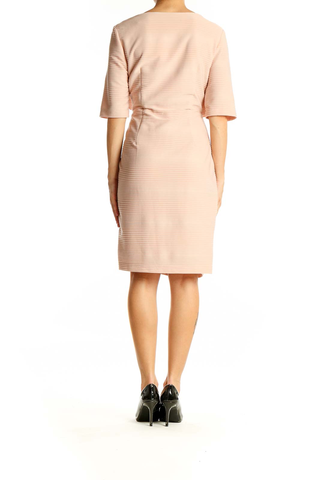 Back view of Connected Apparel blush ribbed bodycon midi dress showing fitted silhouette