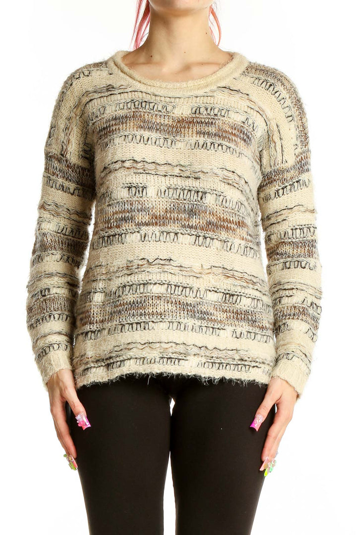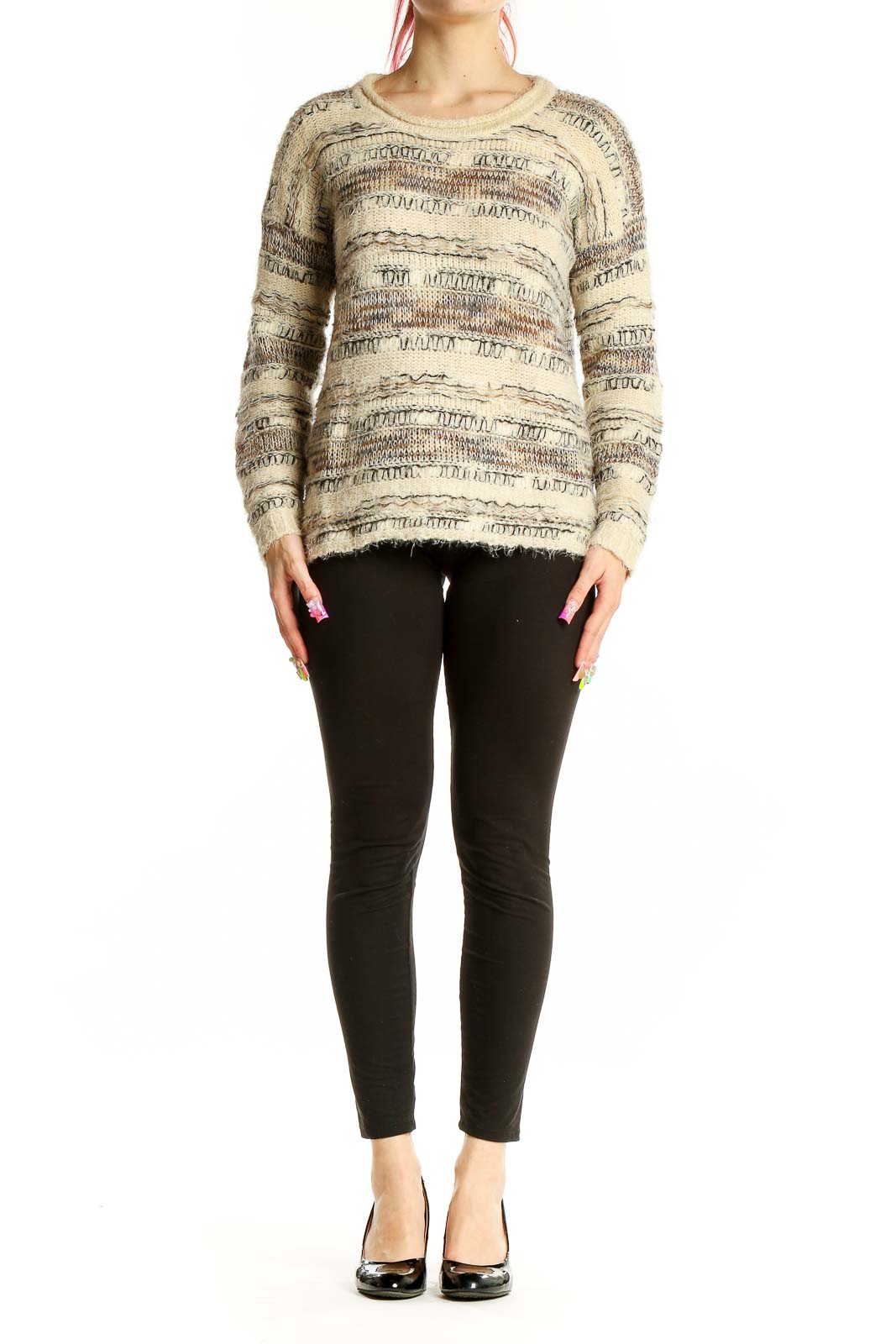 Front view of Sisters beige textured knit sweater with intricate patterns
