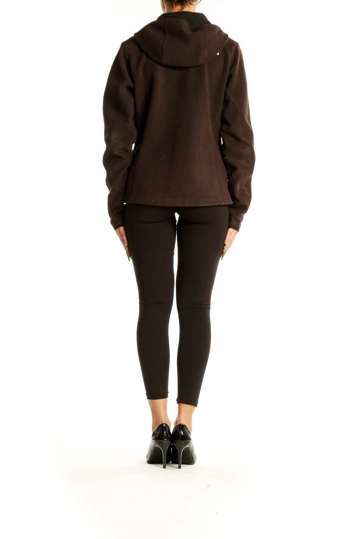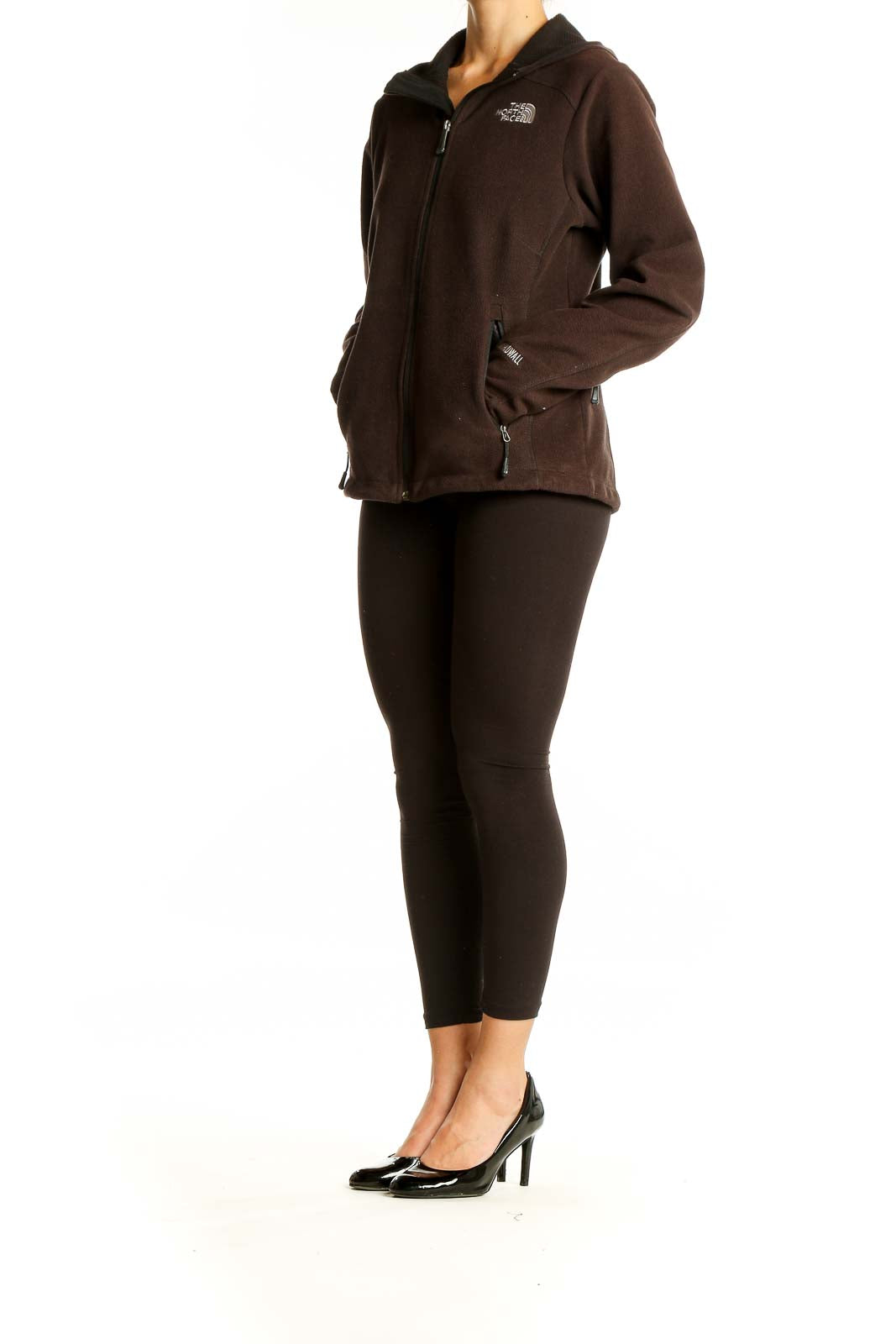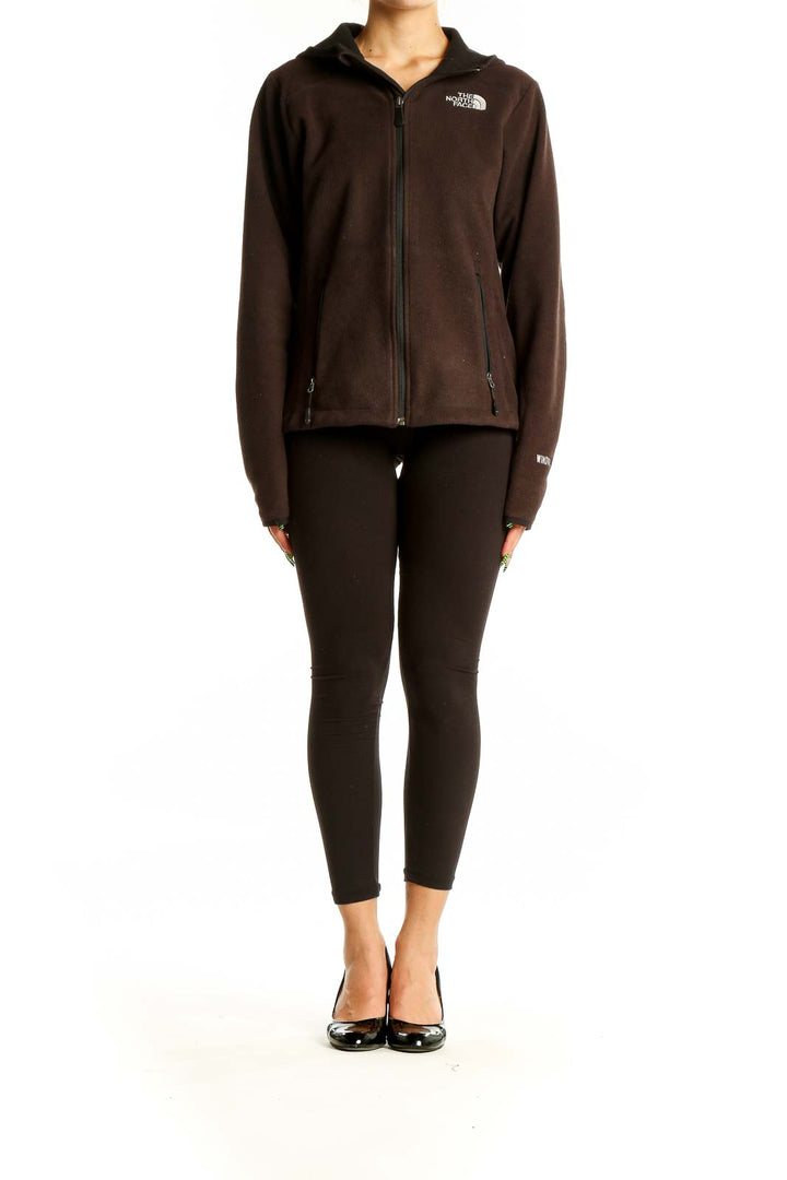 Stay warm and stylish with this classic brown polyester fleece zip-up hoodie from The North Face. Perfect for outdoor activities or casual wear, this versatile piece offers both comfort and functionality. The full-length zipper allows for easy on and off, while the hood provides extra protection against the elements. Side zip pockets offer convenient storage for small essentials. Made from durable polyester material, this hoodie is built to last and maintain its shape wear after wear. In good condition, it's a reliable choice for your active lifestyle. The fitted silhouette flatters your figure while allowing room for layering. Whether you're hitting the trails or running errands, this North Face hoodie is your go-to for warmth and style.