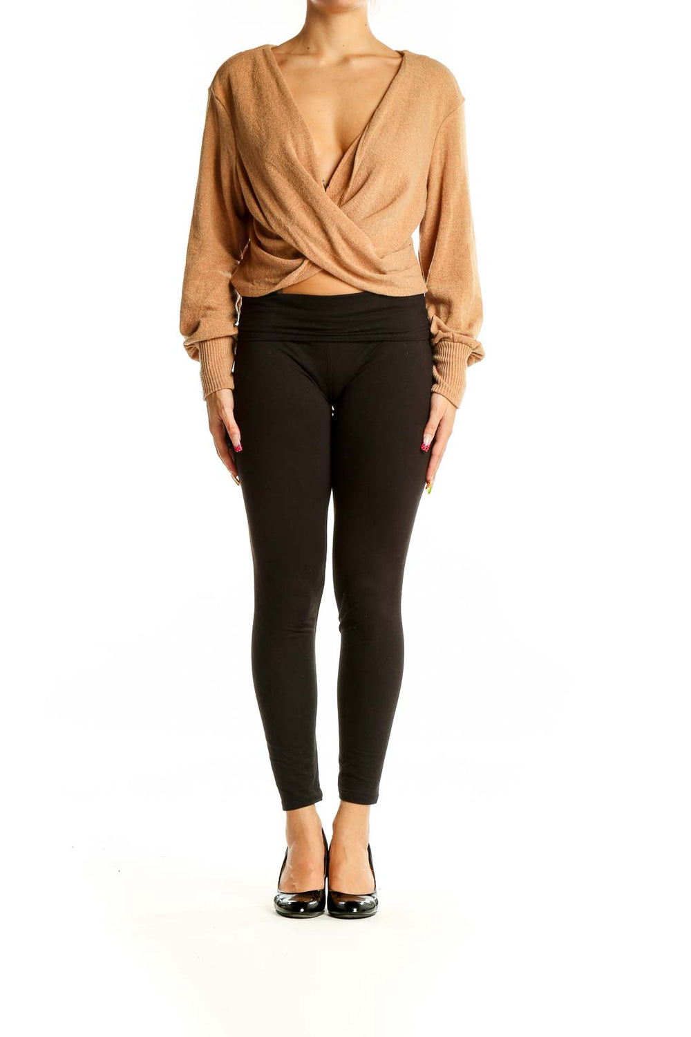 Elevate your casual wardrobe with this chic camel-colored wrap-front cropped sweater from Anthropologie. Crafted from a soft and stretchy blend of polyester and spandex, this top offers both comfort and style. The deep V-neckline created by the wrap design adds a touch of allure, while the cropped length makes it perfect for pairing with high-waisted bottoms. Long sleeves with ribbed cuffs provide a cozy feel and a polished finish. The sweater's relaxed fit and twisted front detail create a flattering silhouette that's both on-trend and versatile. In excellent condition, this Anthropologie piece is a must-have for those who appreciate effortless elegance in their everyday wear.